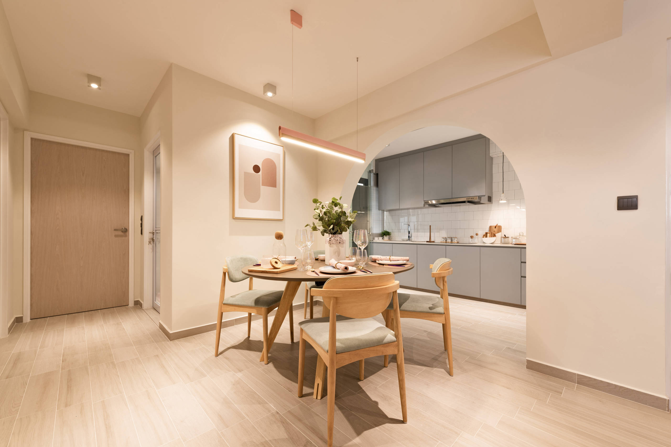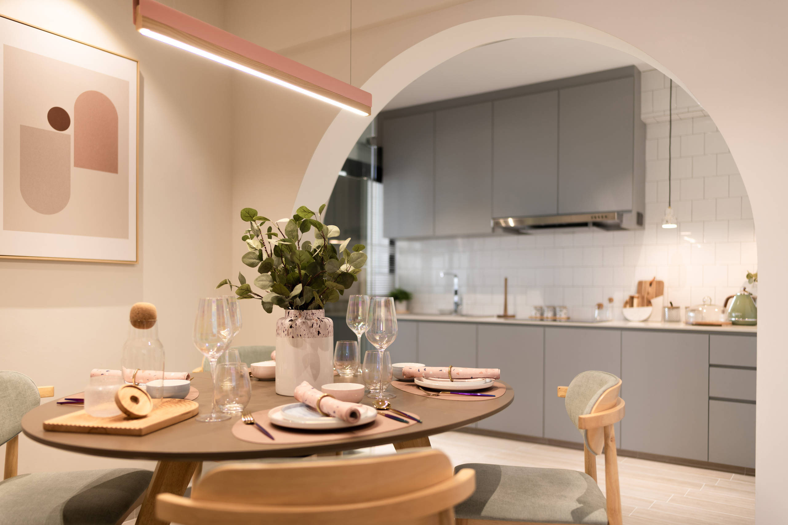 Tweaks to the layout for the flat include opening up the kitchen and replacing its wall with an arch. “The huge arch effect adds a more graceful rhythm to the place,” says Deng.