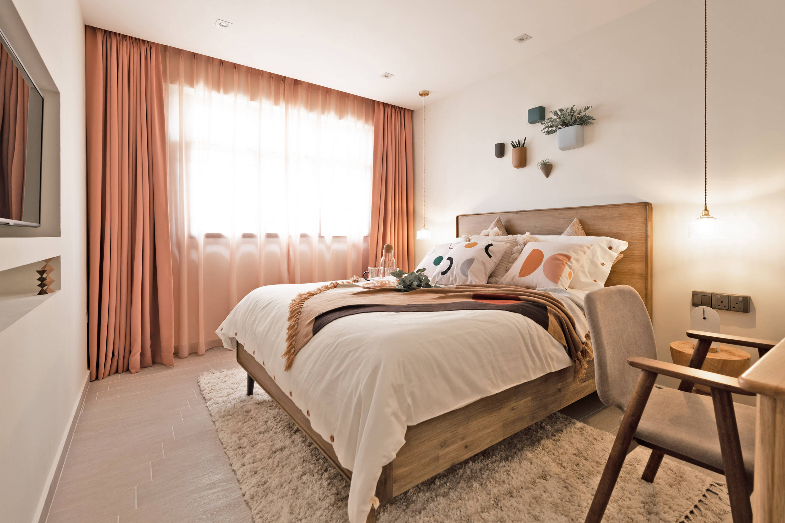 In the master bedroom, the wall facing the bed was rebuilt with a recessed niche “to place their TV and other media devices so they all sit in nicely without eating into the walking space, making the room slightly more spacious,” says Deng. The designers selected the furniture to match the sweet Scandi theme.