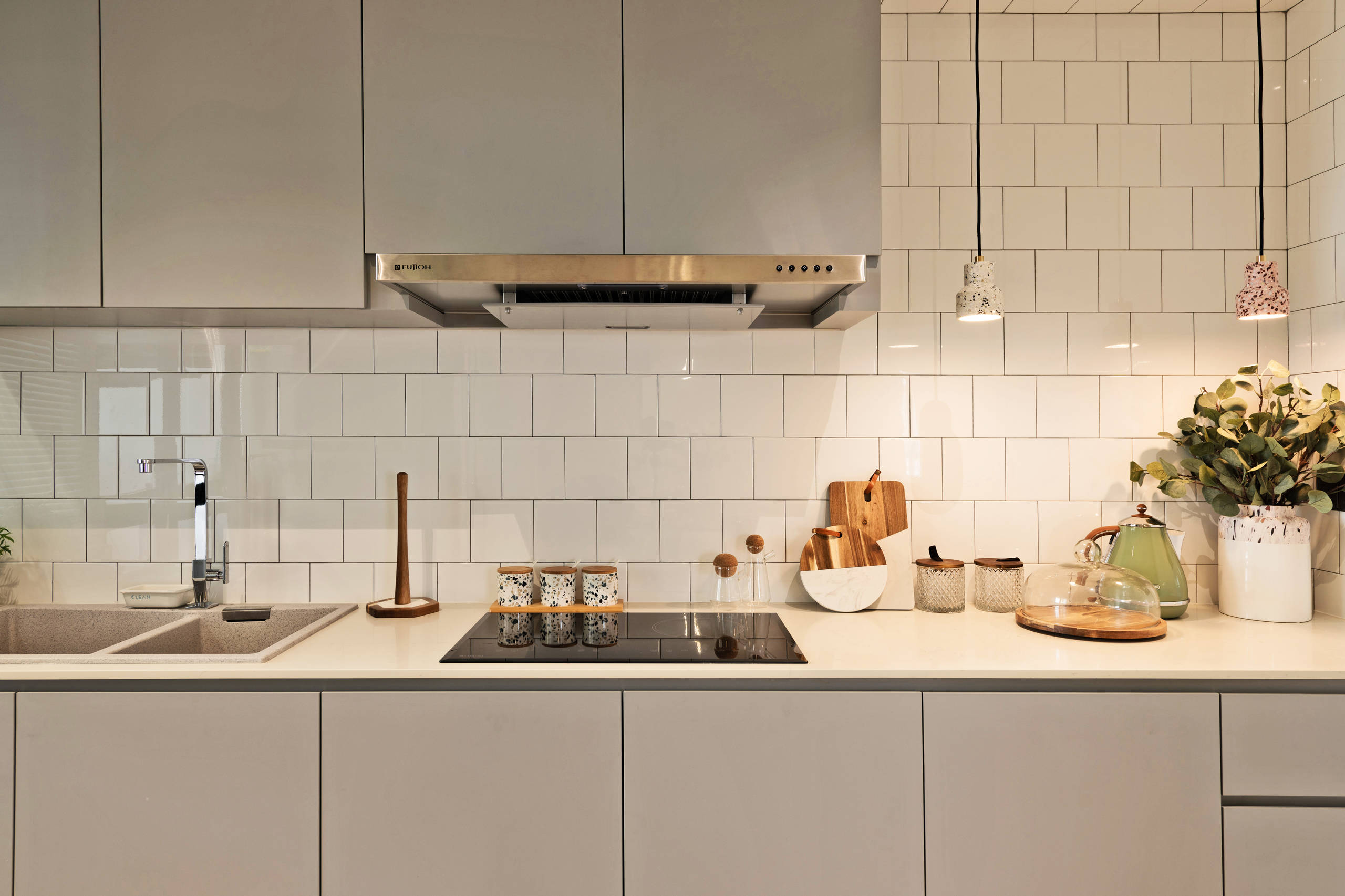 For the kitchen, Deng explains: “We kept the design practical, with a shorter top cabinet space as the owner didn’t need that much storage.” The shorter top cabinet space also allowed for the placement of pendant lights, which is the lighting preference of the owners.