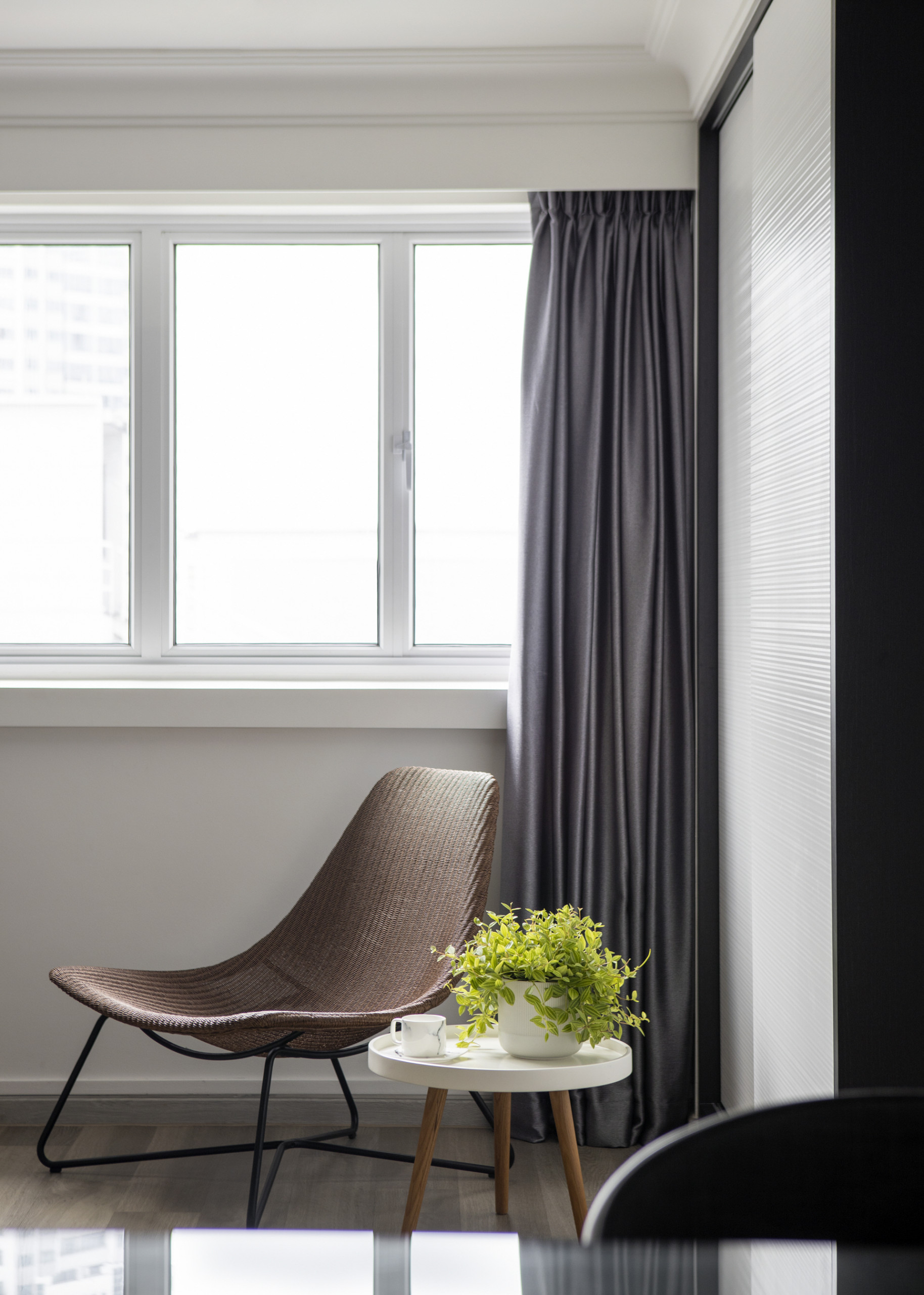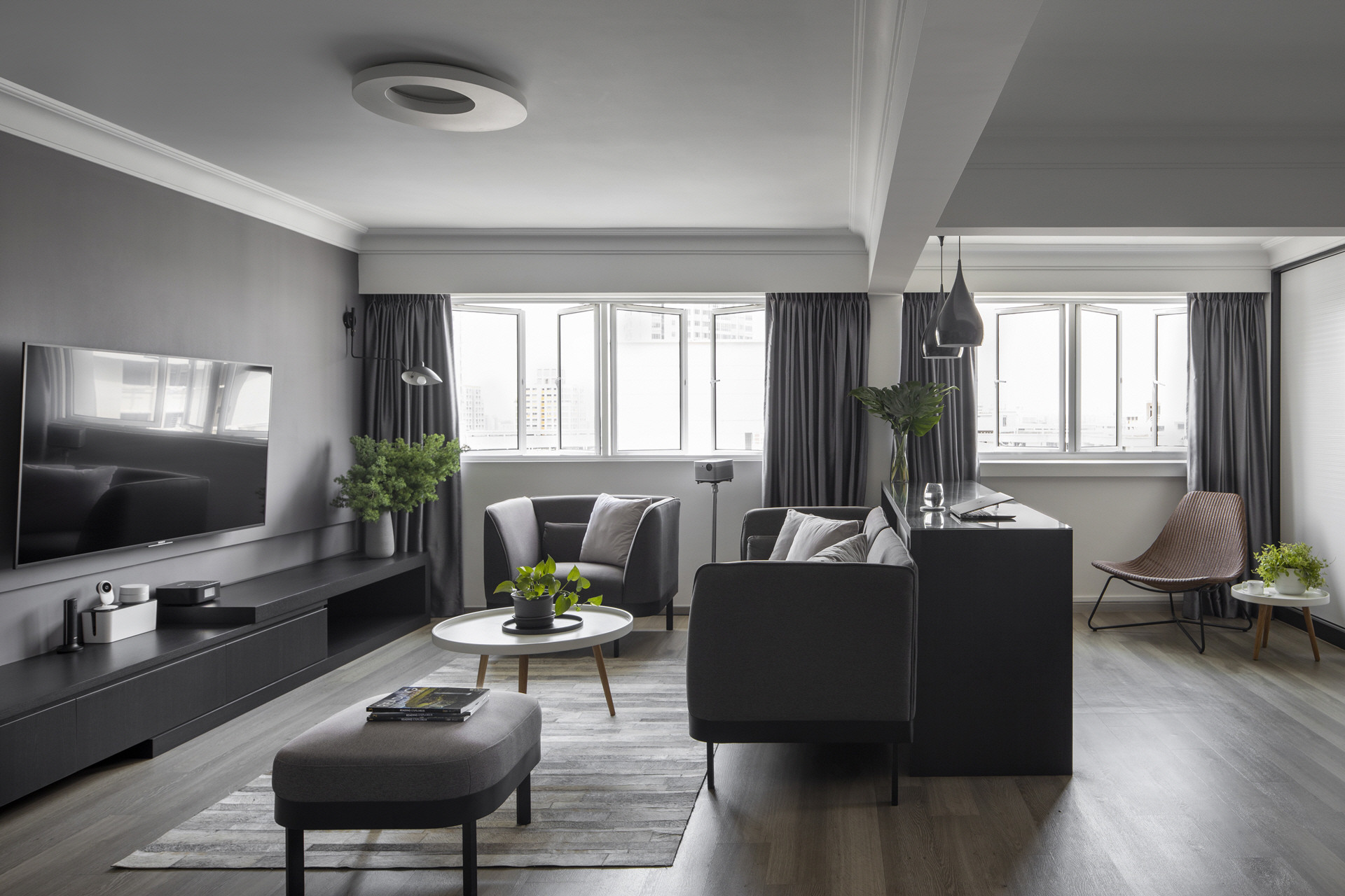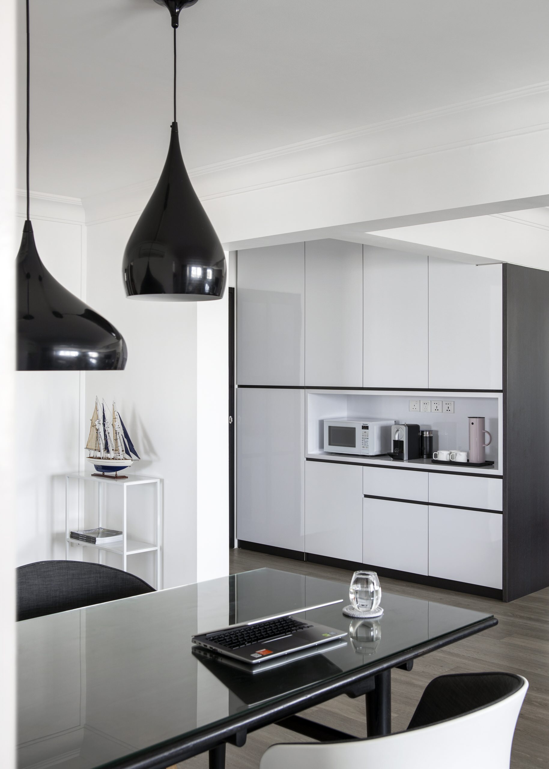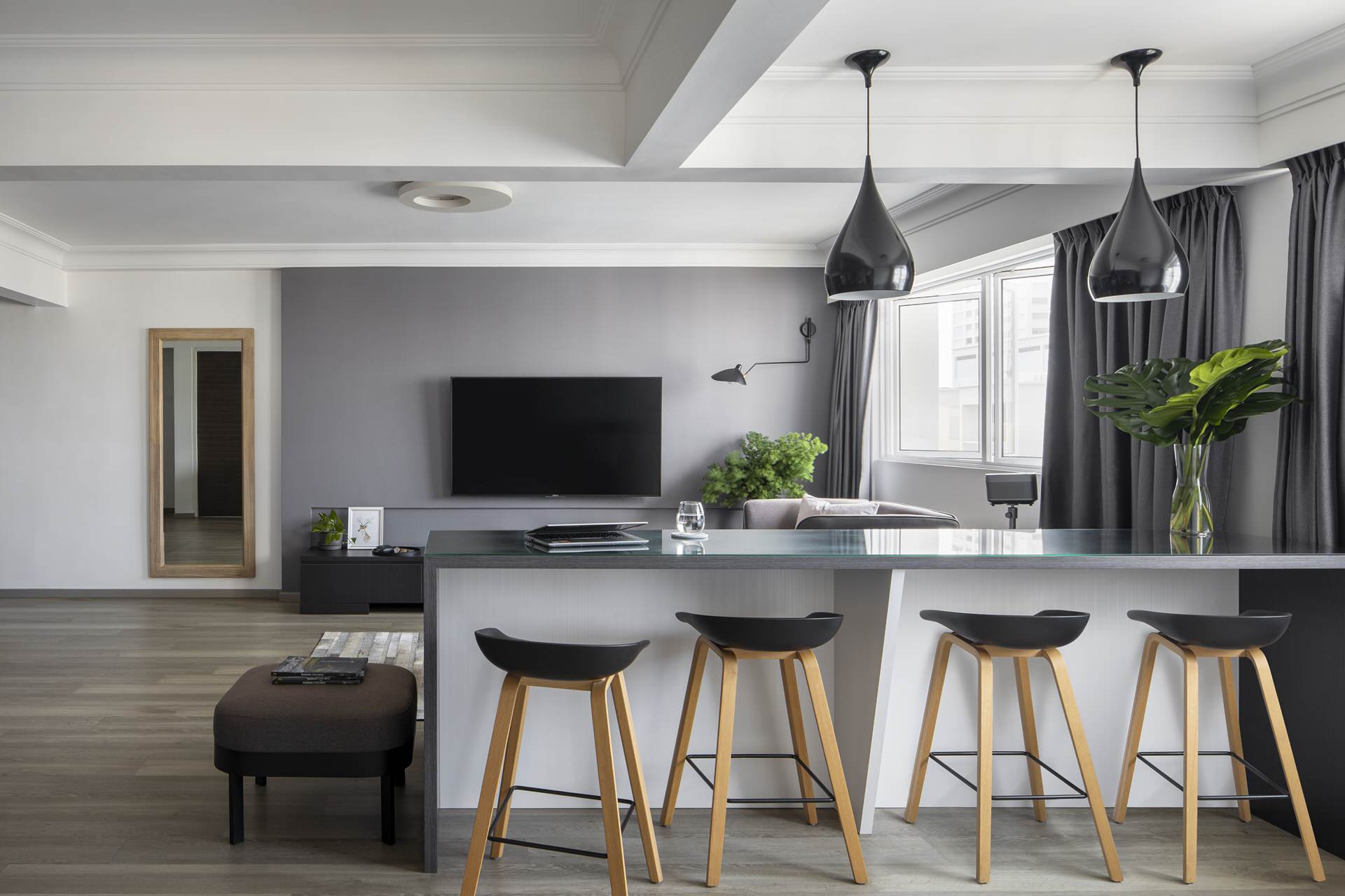 Chua used a black-grey-white colour scheme with wood details “because these colours evoke a cosy and warm, inviting feel, and enable the space to bring out an elegant and luxurious atmosphere”.