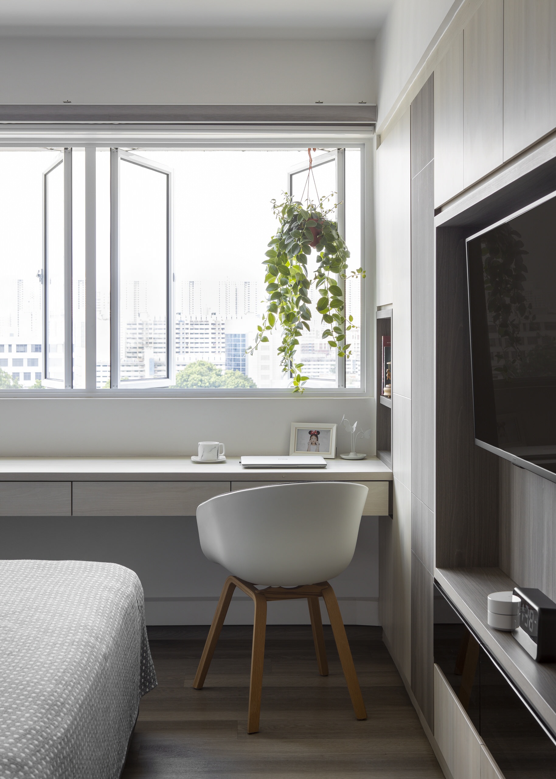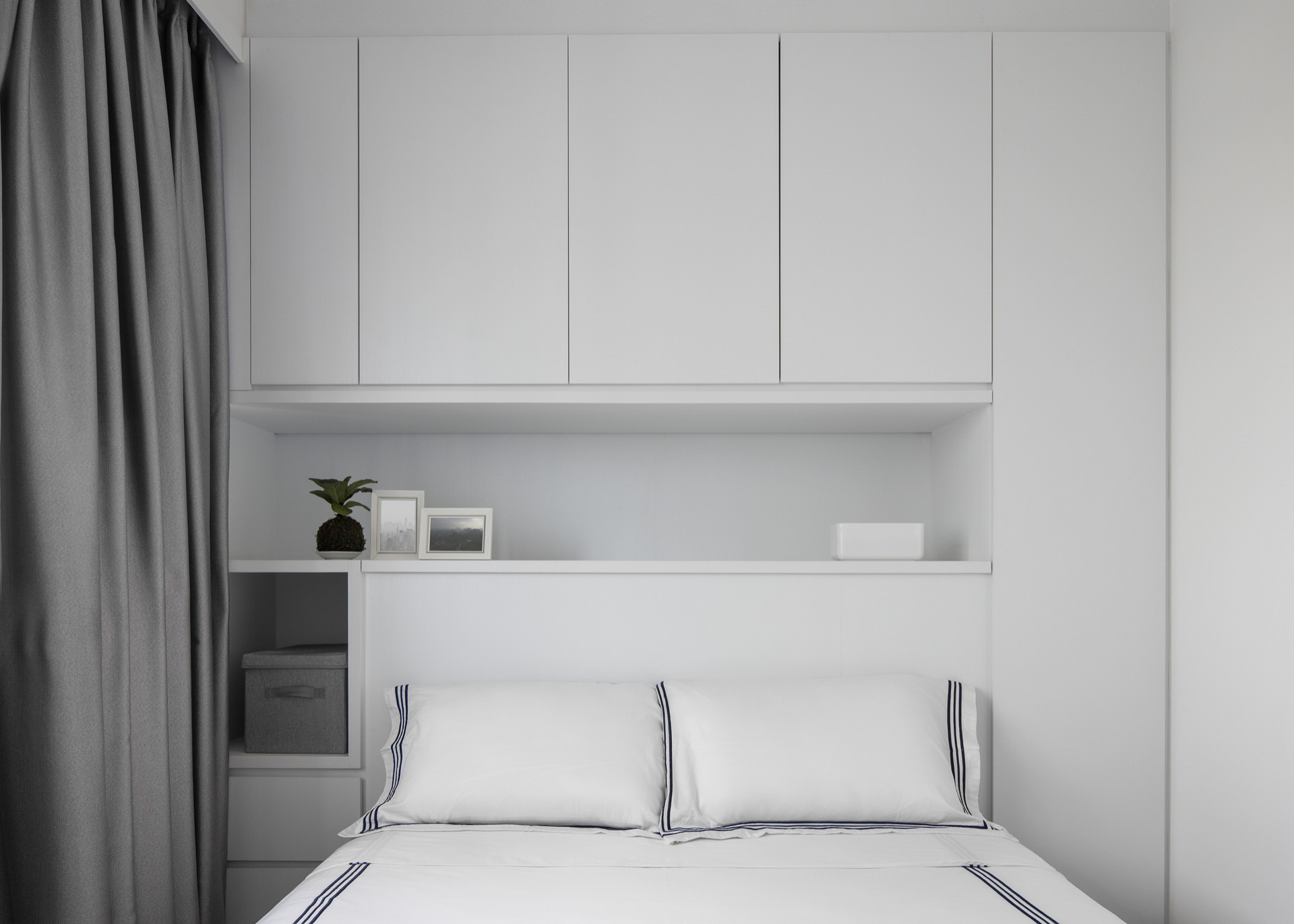 The common room was designed as a guest bedroom, with a custom-built cabinet integrated with the bed. Chua designed it in a restful white and grey colour scheme.
