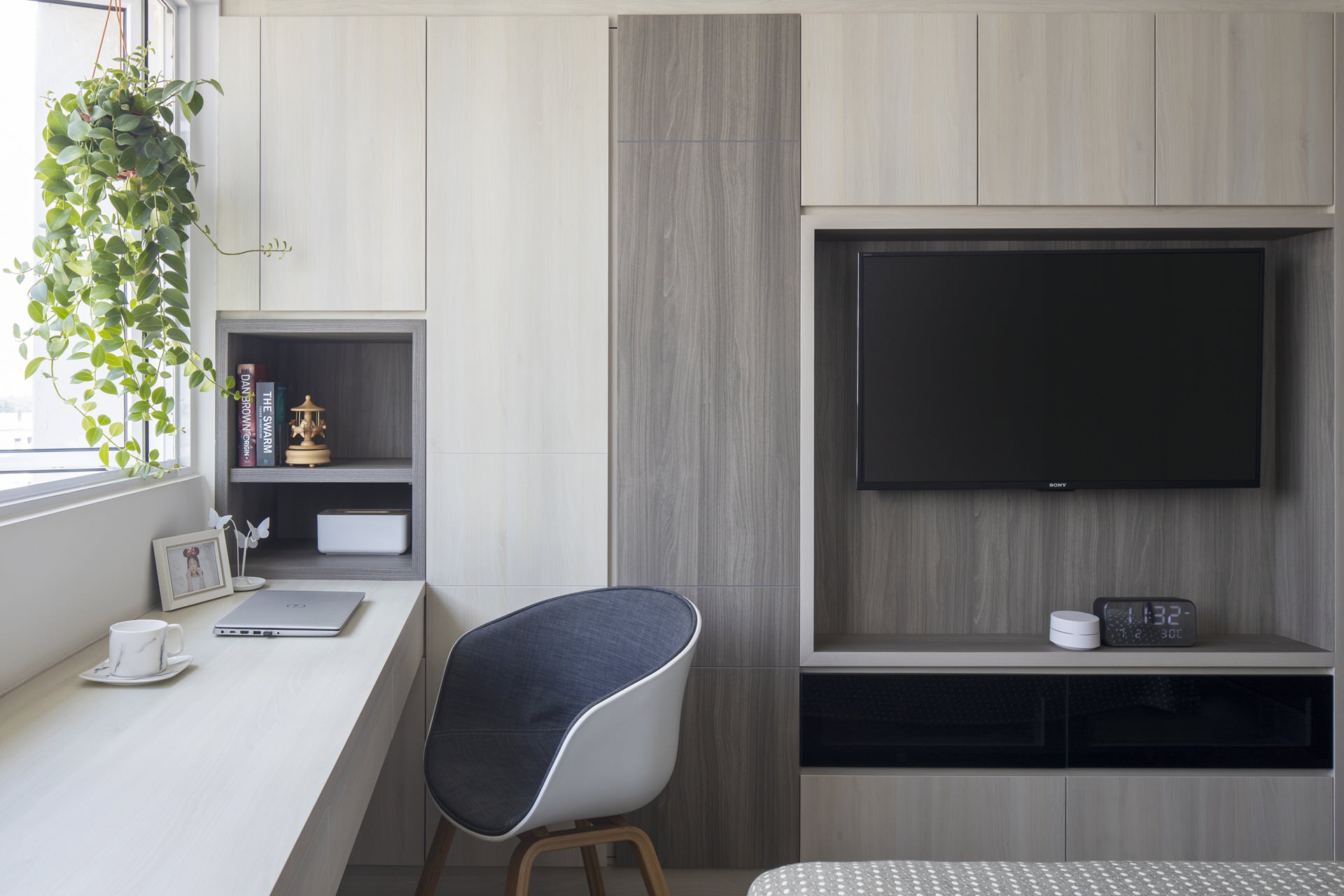 The master bedroom was designed with a purpose-built work space. Perpendicular to the work space is a thoughtfully designed feature wall incorporating storage, TV and part of the wardrobe.