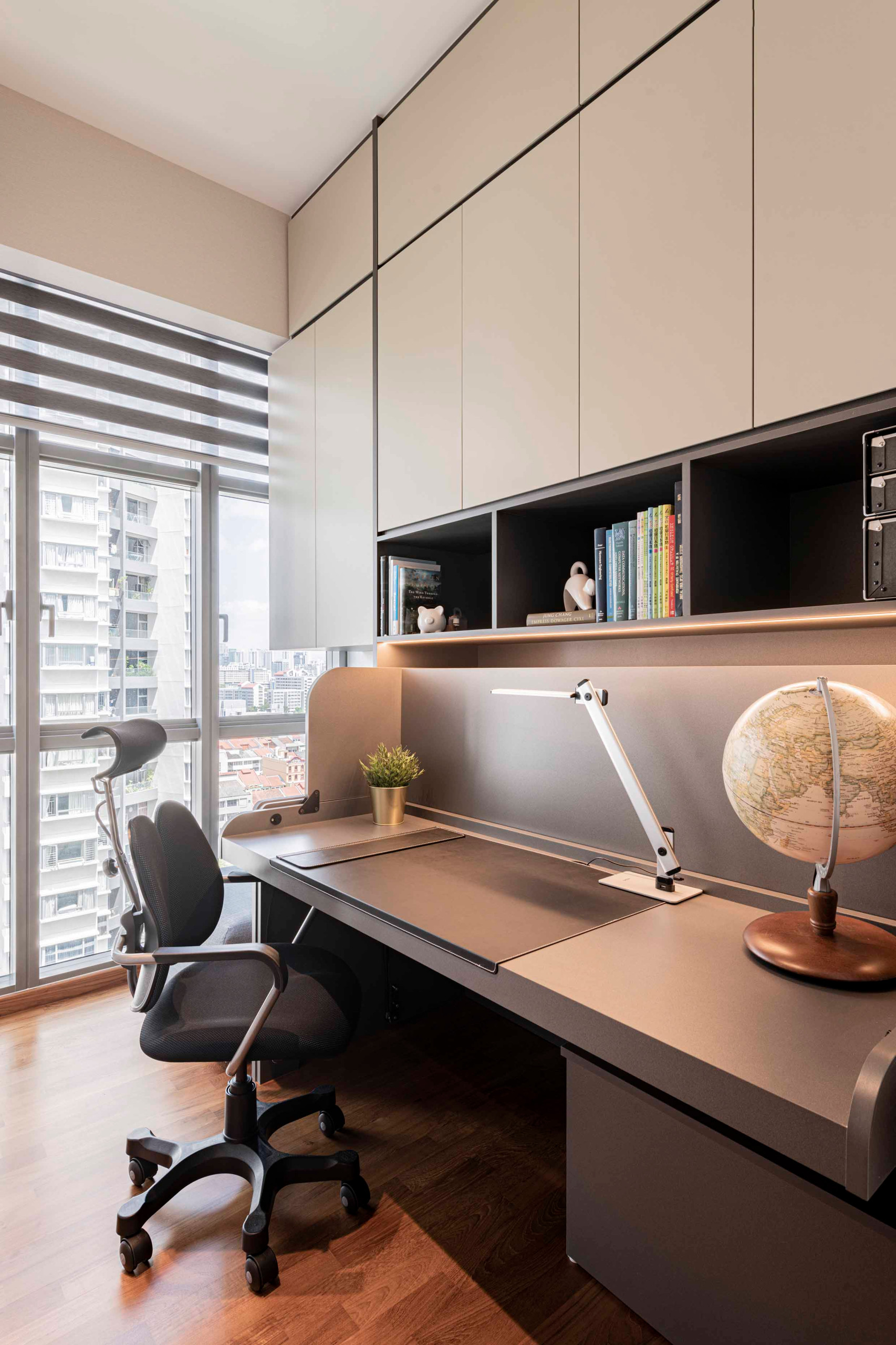 In the study room, which doubles as a guest room, Teo customised a desk with a hidden bed: the desk flips out to reveal the guest bed. Here, too, the warm brown colour palette is used for cosy ambience that is consistent with the rest of the home.