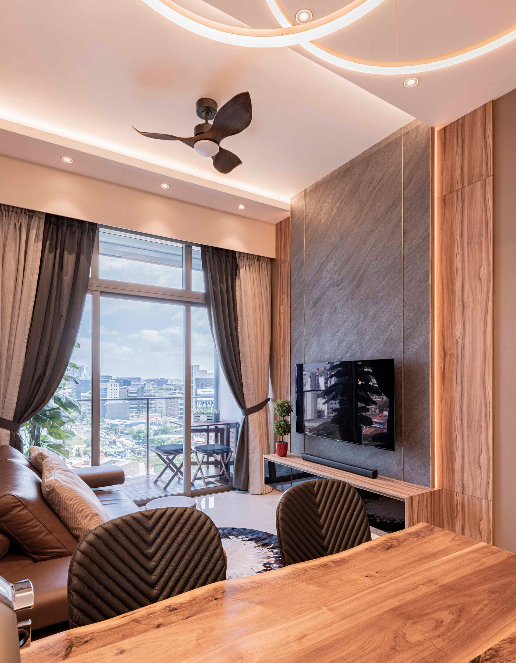 The same warm lighting and woodgrain appear on the living room TV feature wall which the designer describes as the wow factor of this open-concept communal space. A backlit granite panel adds some gravitas to the entertainment feature.