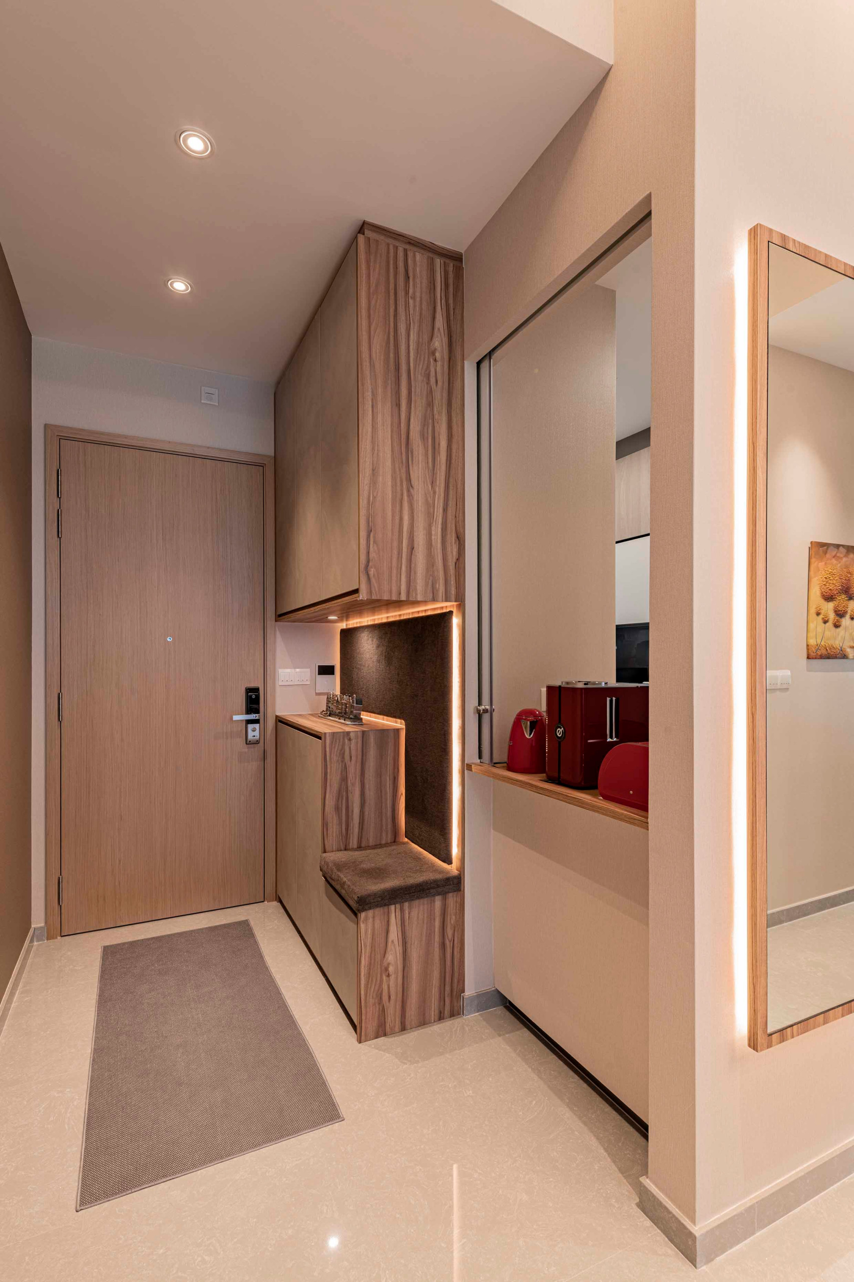From the entryway, the custom shoe cabinet sets the cosy tone with its warm lighting and wood-look finish. It helps to frame the window into the kitchen as well, adding more depth to the functional niche.