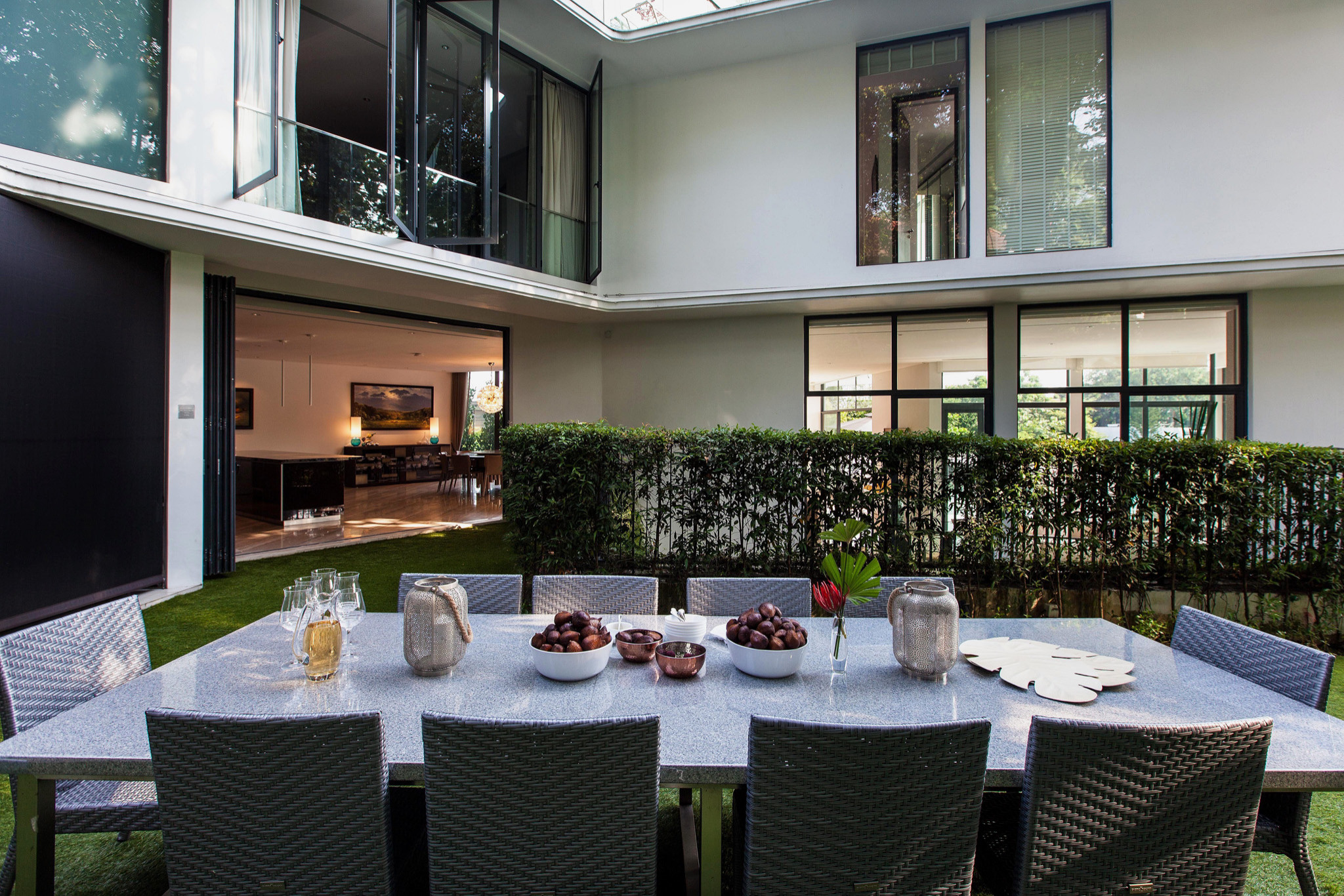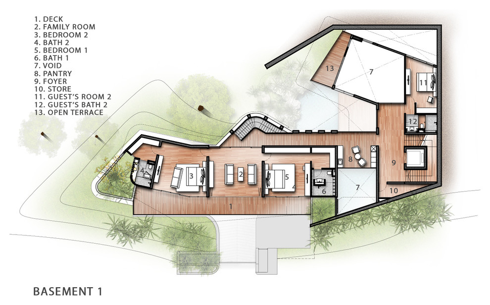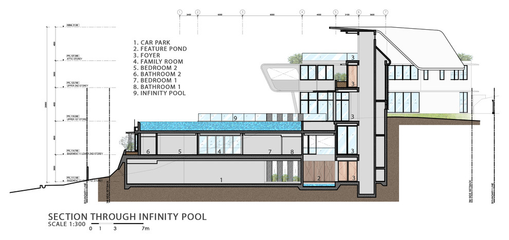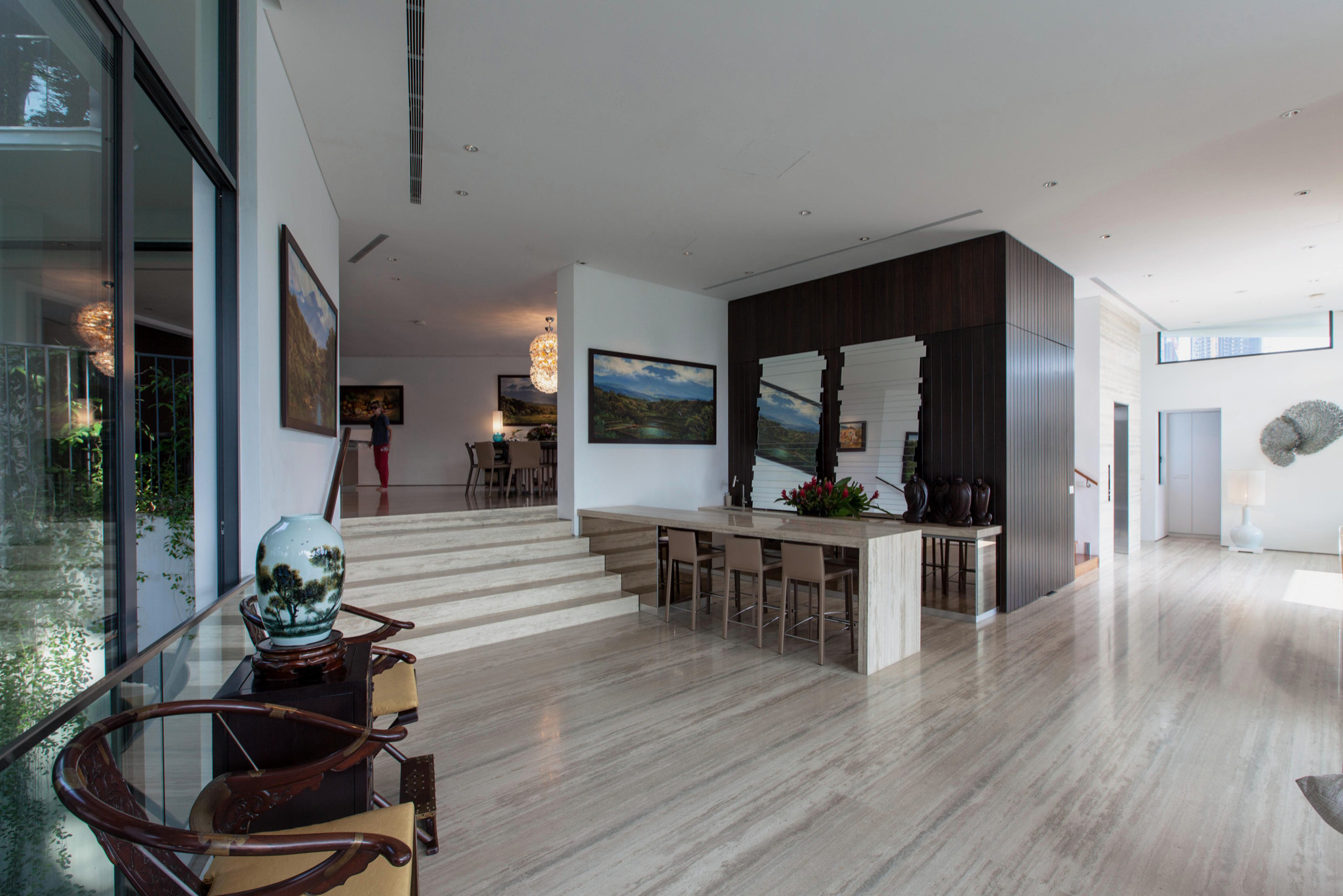 “Due to the steepness of the slope, the entrance was at basement 2. As you pass the carpark at basement 2, you are surprised by a large internal garden/waterfall courtyard and ponds that not only create internalised views for the double volume entertainment hall at this level but also provide for ample natural light and ventilation,” says Taher.