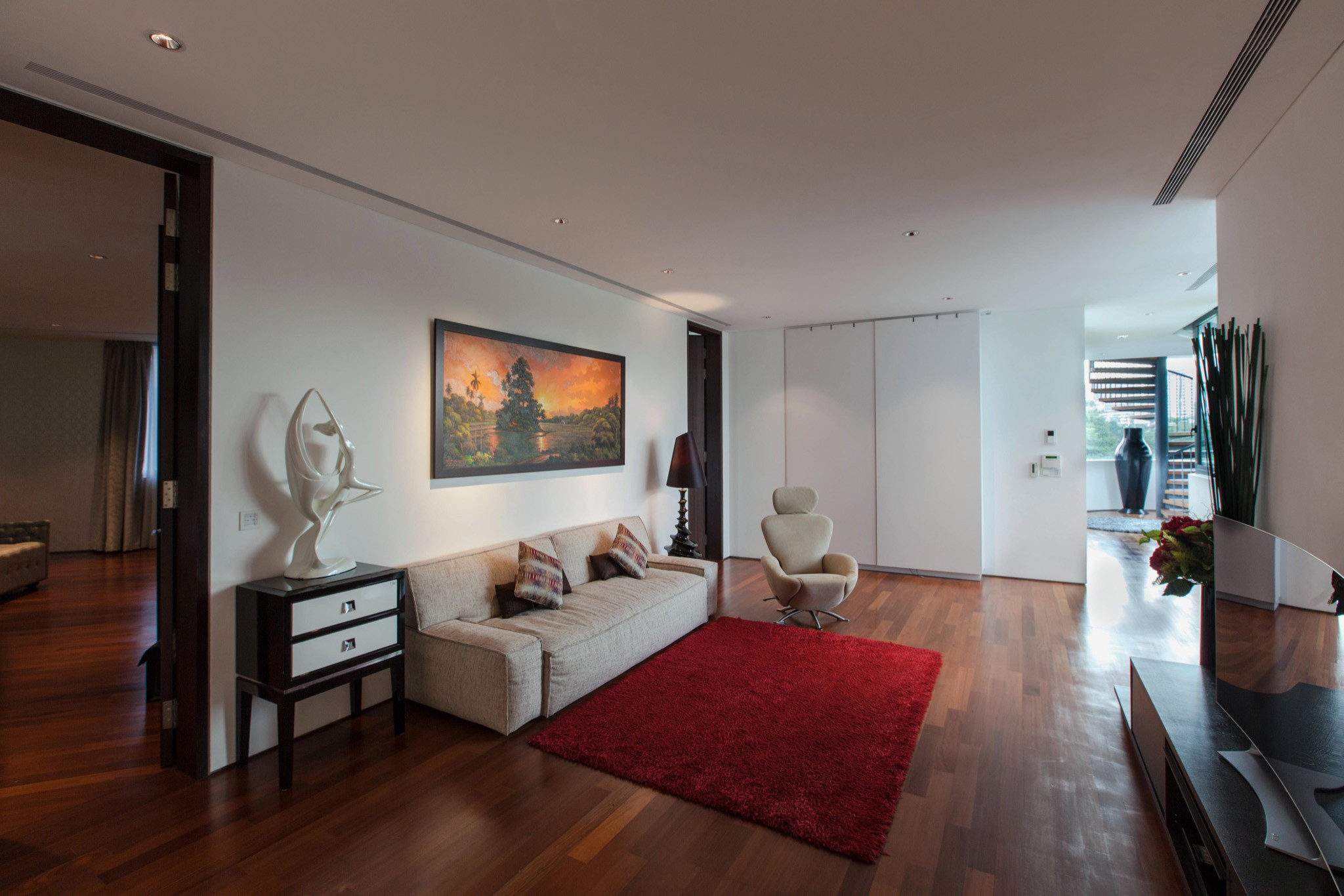 The first of three living areas – what Taher refers to as the entertainment hall – beckons from the foyer. With a double-height ceiling, and flanked by the waterfall-garden and another pocket garden, you’d immediately forget that this is a basement level space.