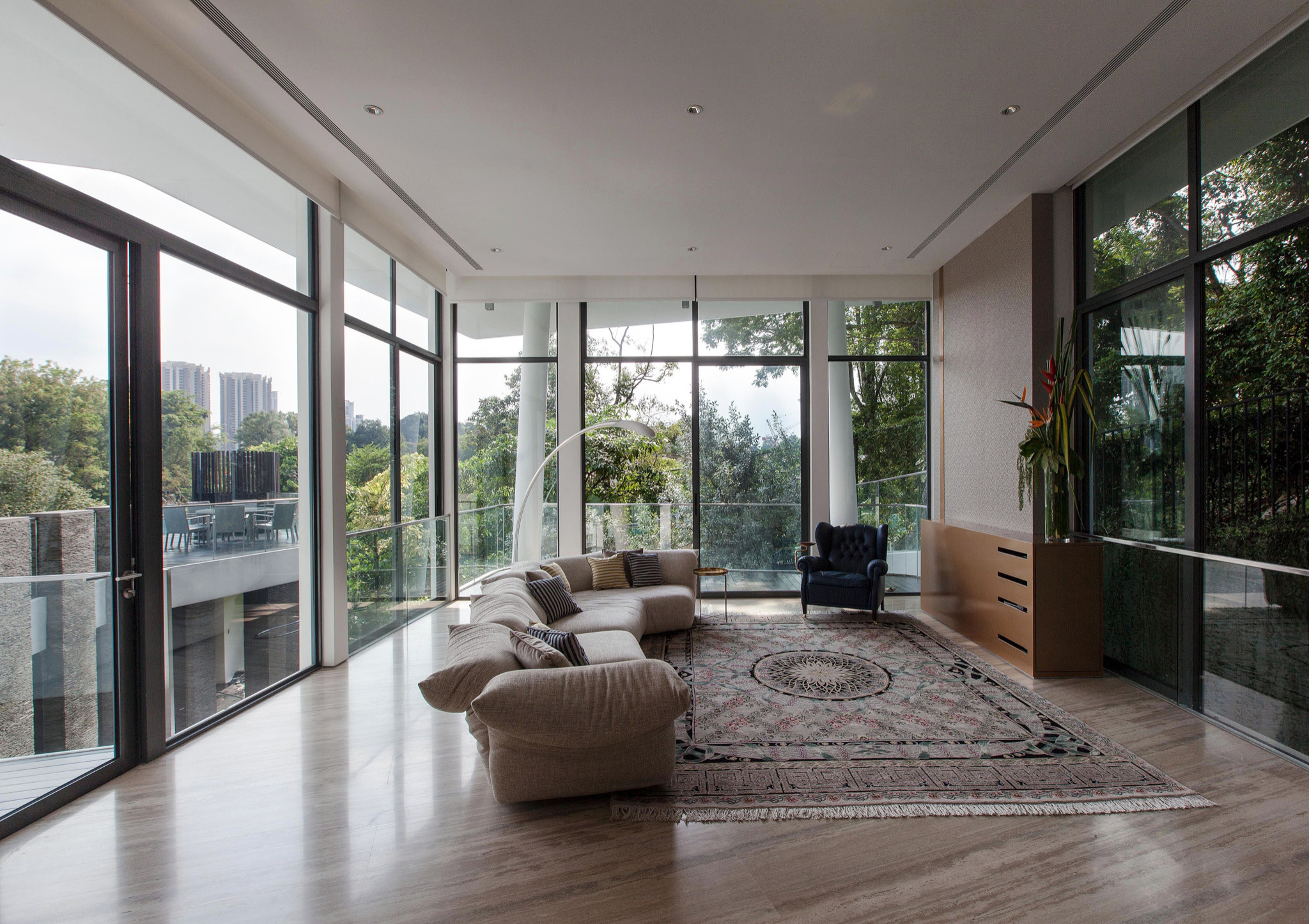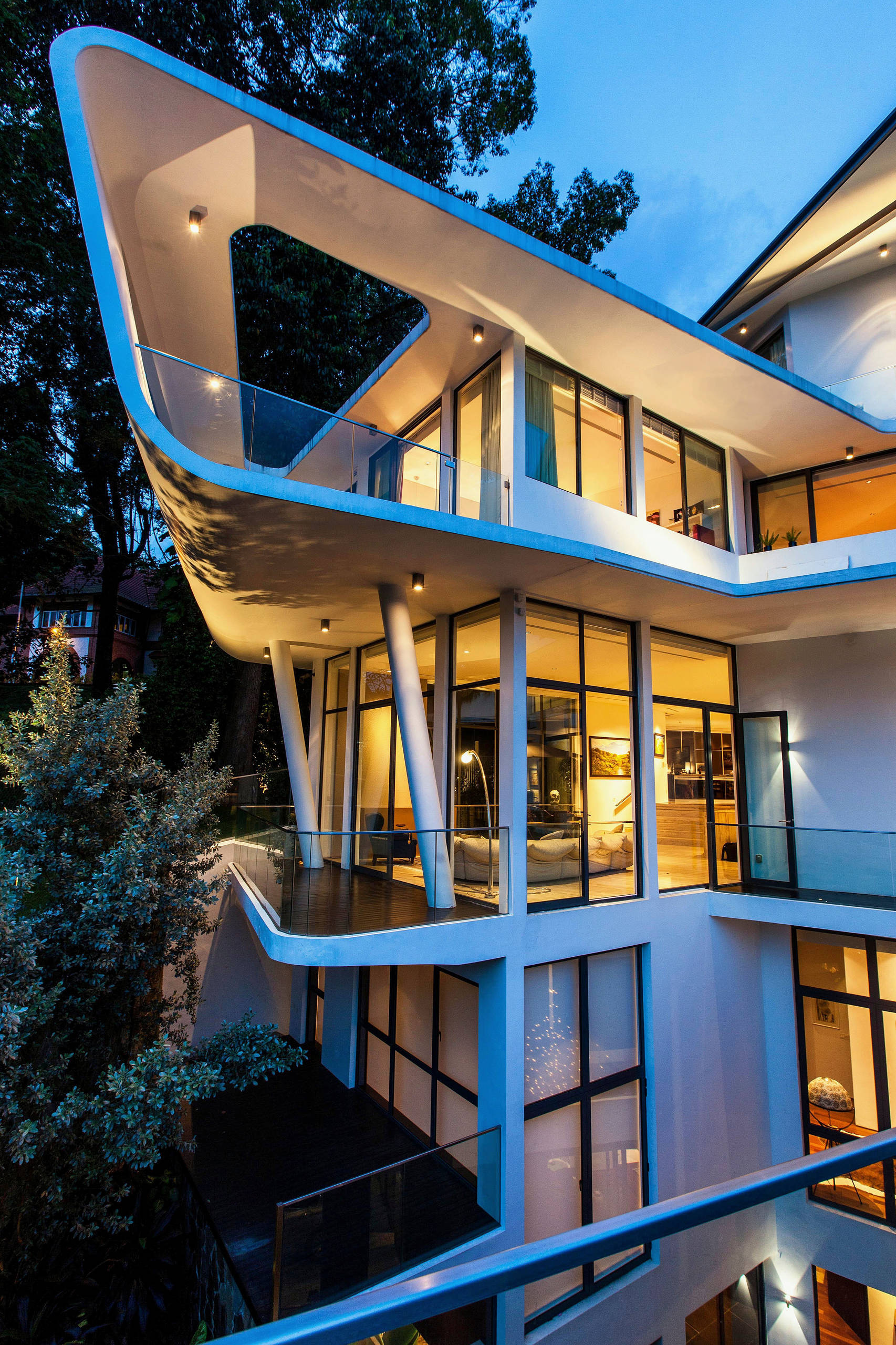 To build the seven-bedroom home for three generations – a family with two adult sons, a teenage daughter, the youngest son and grandparents – the house was designed to “meander fluidly upwards over five floors diverting around the very mature trees.”