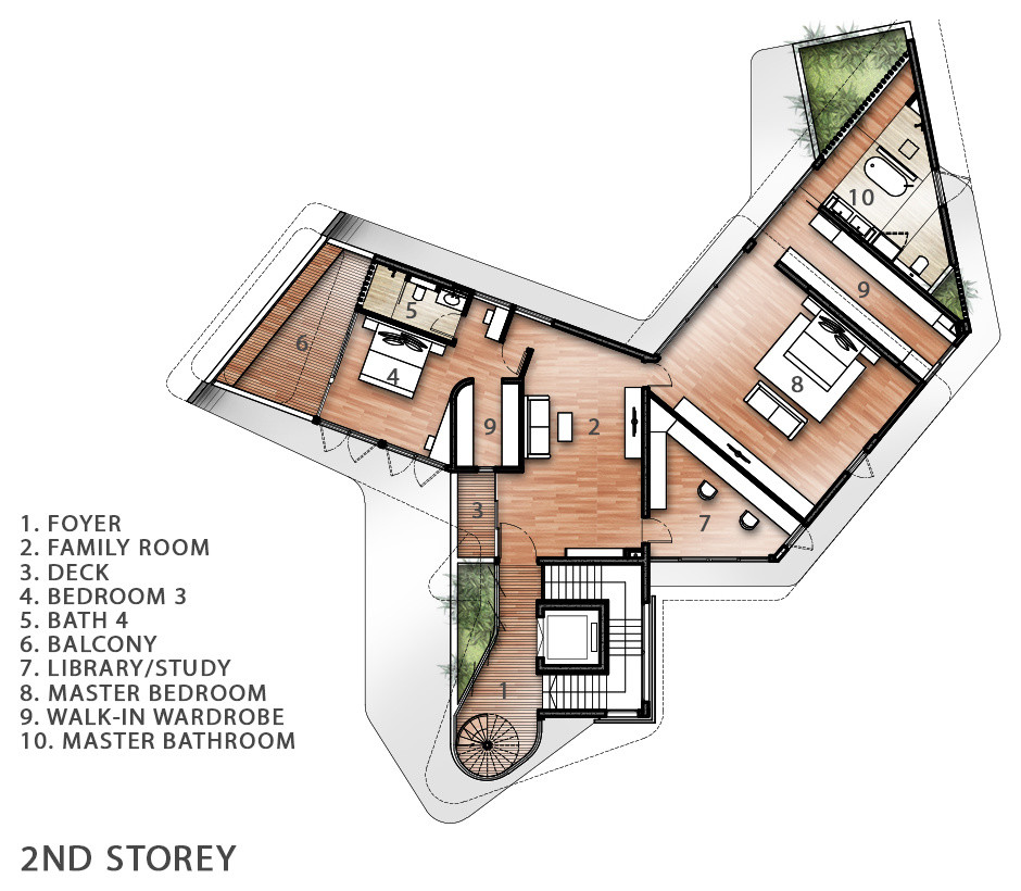 Surrounded by pocket gardens accessed through a deck, the adult sons’ bedrooms evoke a resort-like ambience.