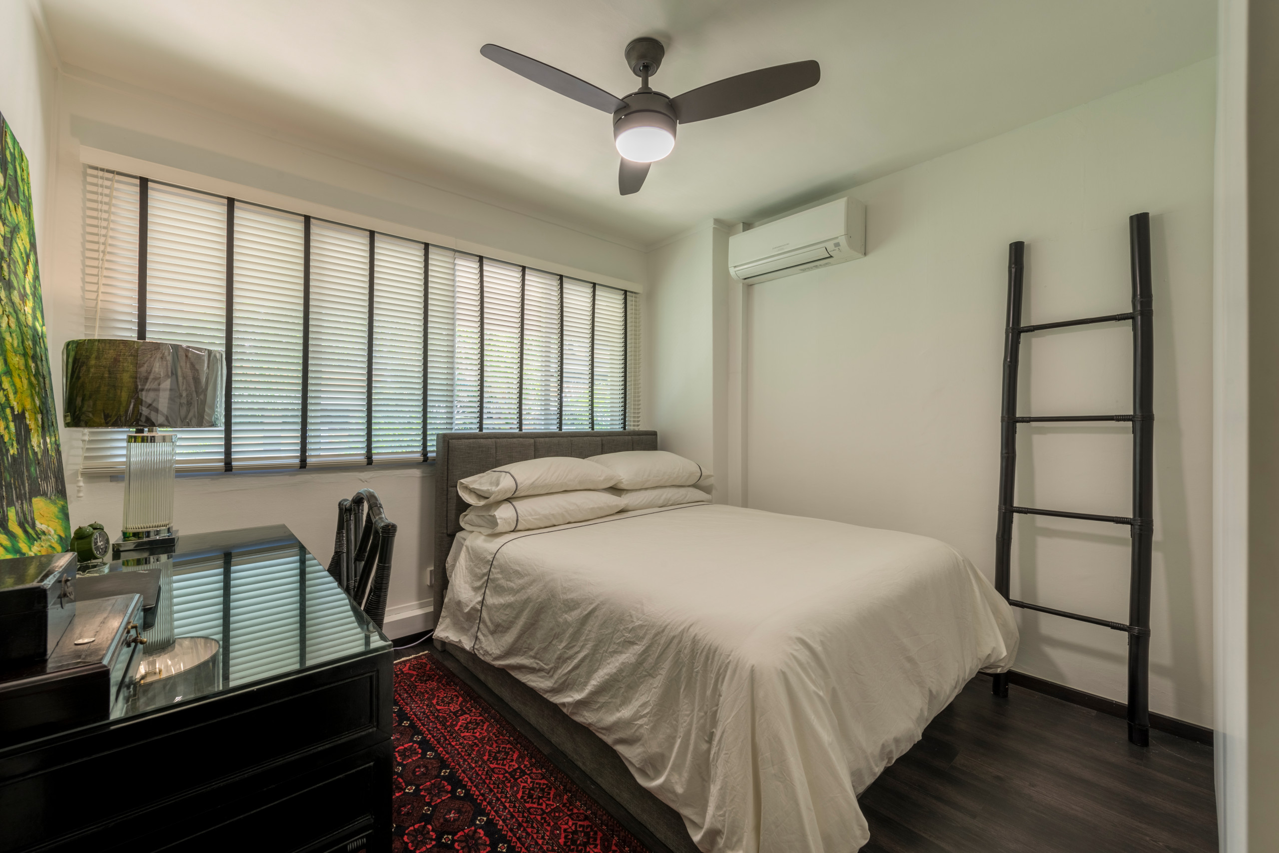 “The bedrooms have plenty of cabinets, but not enough floor space. We opted to paint the walls light grey to help create a more comfy environment,” says Tan. In the parents’ bedroom, dark wood drawer cabinets with gold hardware and matching table lamps glam up the space.