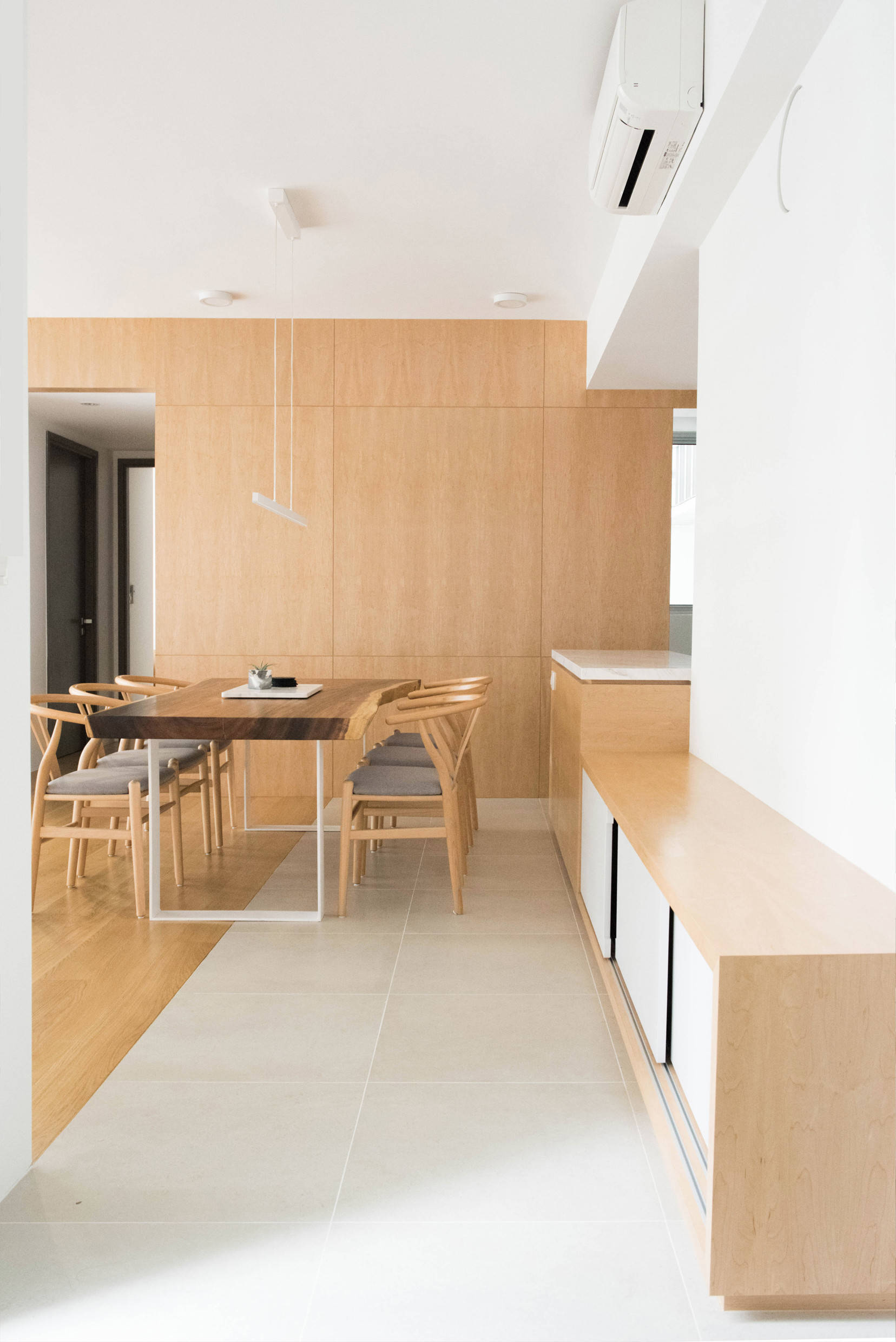 The choice of a solid wood live-edge dining table with white metal legs is a clear match for the apartment’s material palette, says the designer. A simple bar pendant light completes the streamlined look of the dining area.