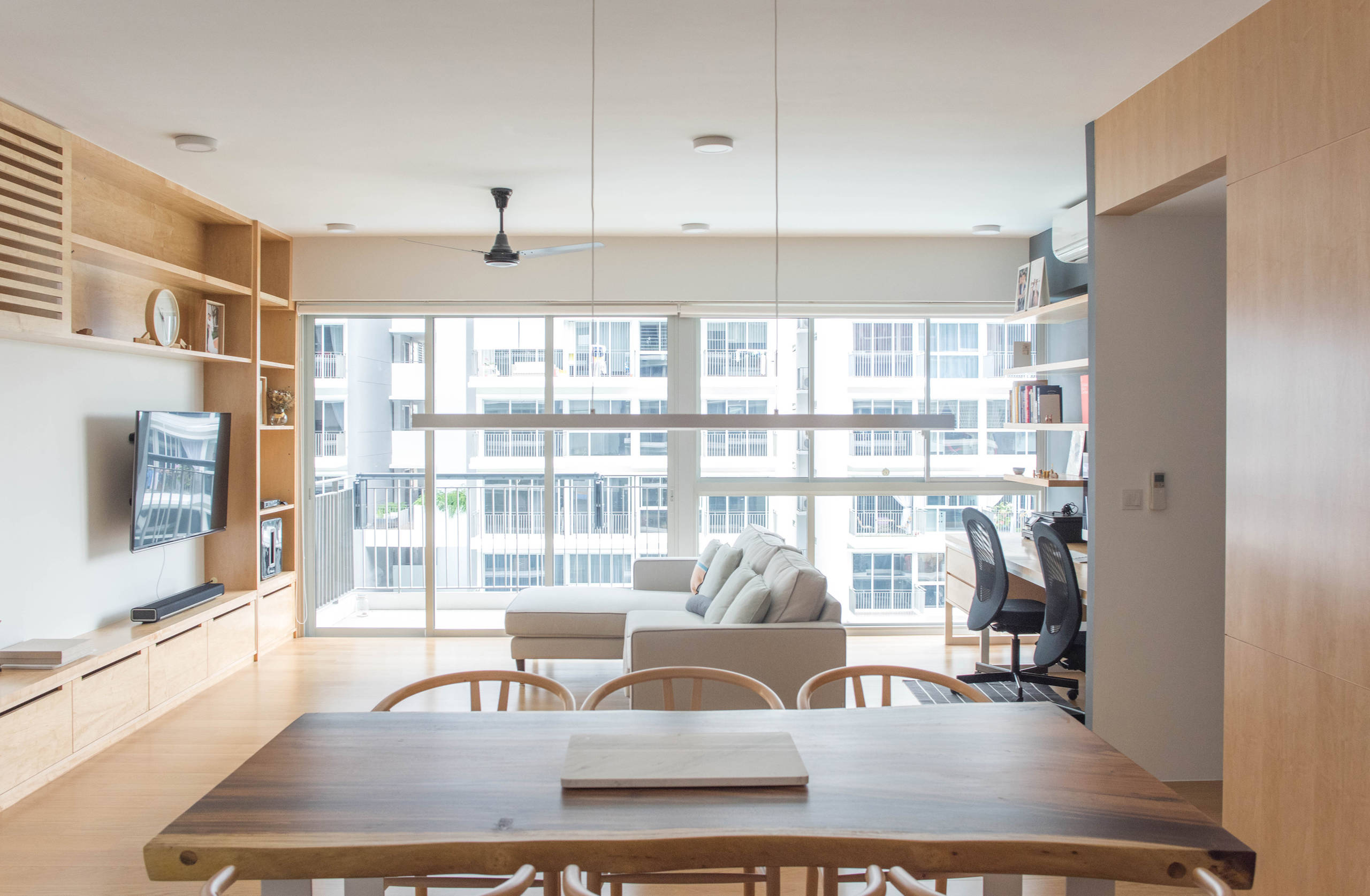 One of the bedrooms was also hacked open to give way to a larger living space-cum-study. The space is bathed in generous daylight through floor-to-ceiling windows and glass sliding doors, further enhancing the airy and spacious open-plan layout.
