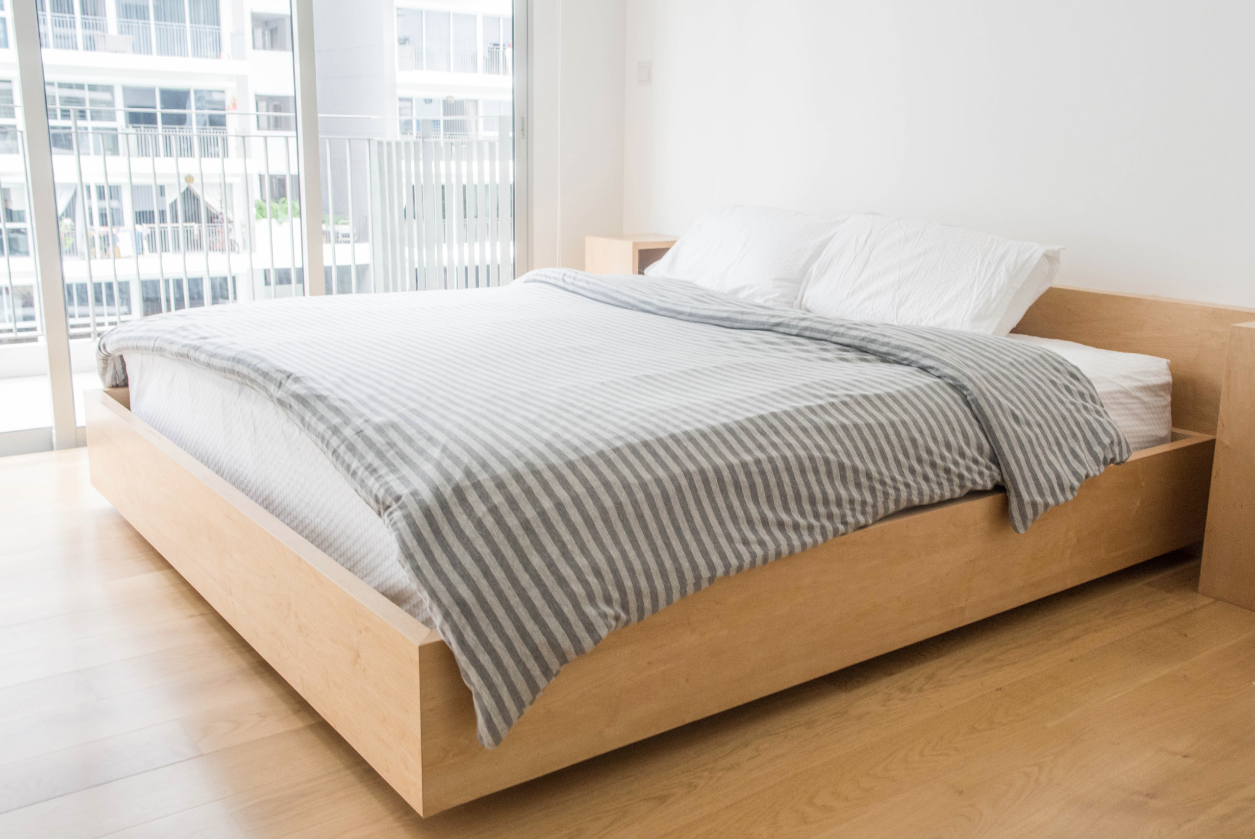 To maximise the space within the bedroom, a vanity desk was tucked into a niche, while existing wardrobe sliding doors were refinished in light grey laminate.