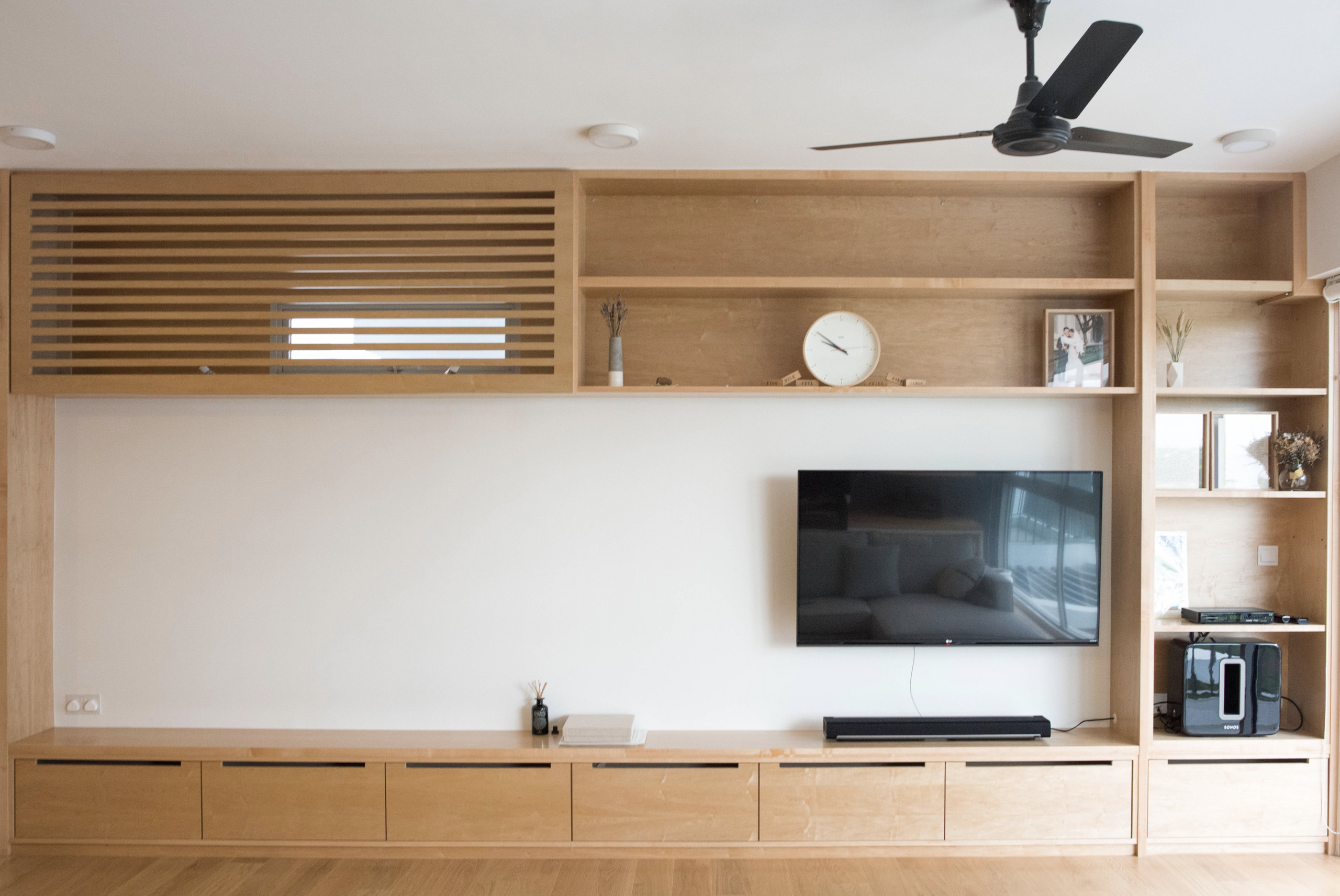 “The full-height TV wall incorporates a low bench for sitting and for displaying artwork while a louvered panel camouflages an existing top-hung window” says O’Neill. In keeping with the warm wood palette, this custom-built piece is made of timber veneer.