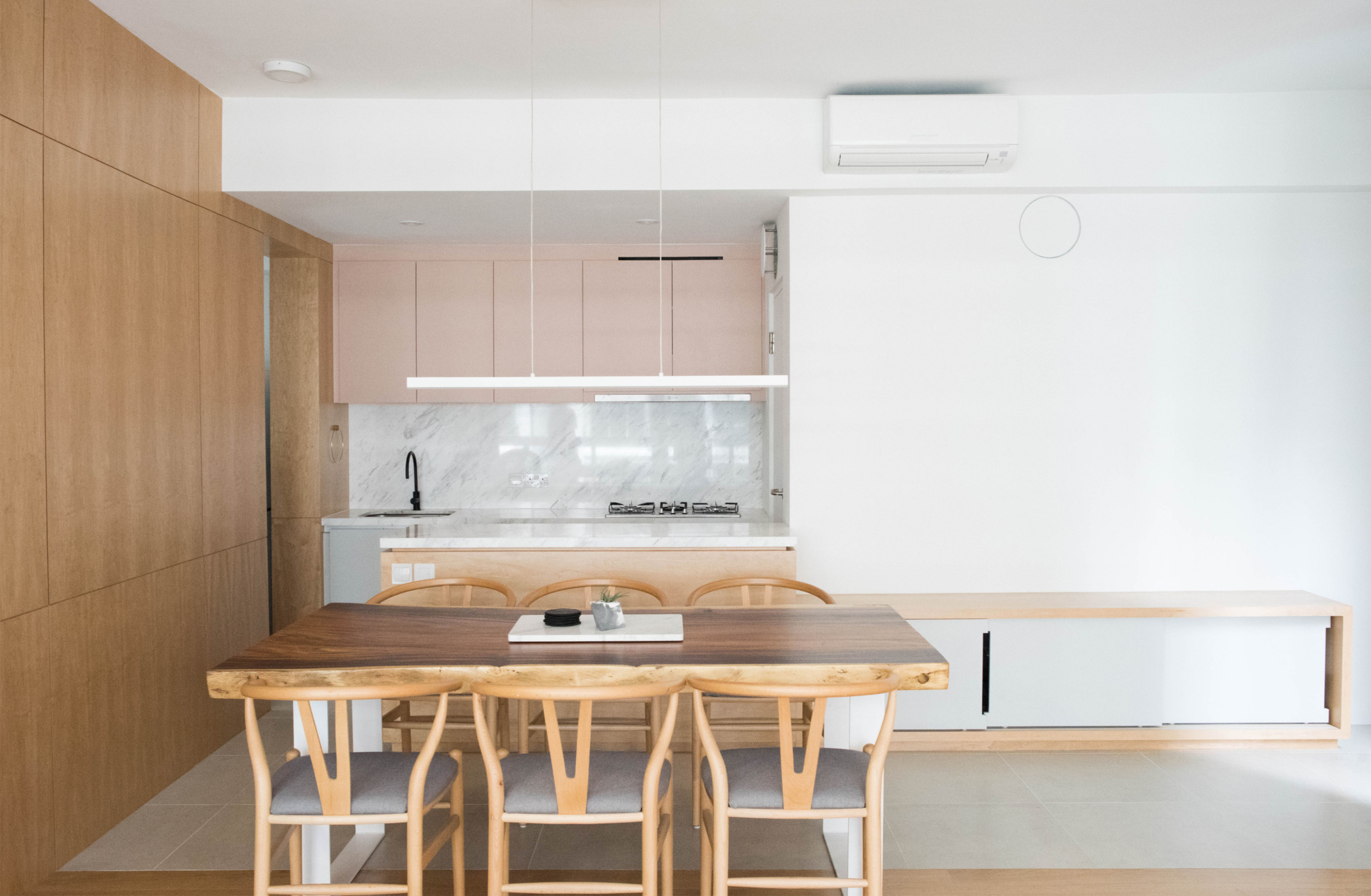 A misunderstanding over the handover date of this condo became a serendipitous boon in this home’s carefully considered design. “Discovering that the owners would only receive the apartment at a later date actually allowed us to slow down the design process, giving us the chance to revisit the design and refine it with the luxury of time,” says designer Pamela Choo O’Neill, director of Studio Roundtop.
