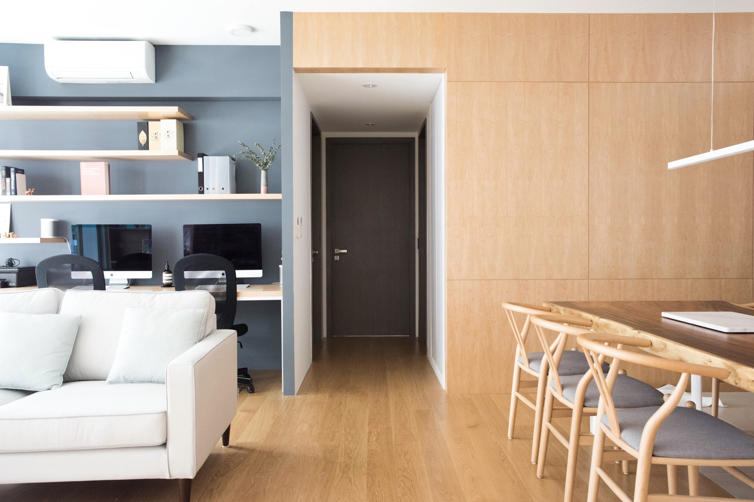 The designer created a shared desk for the couple in the study, which is visually demarcated through a grey wall.