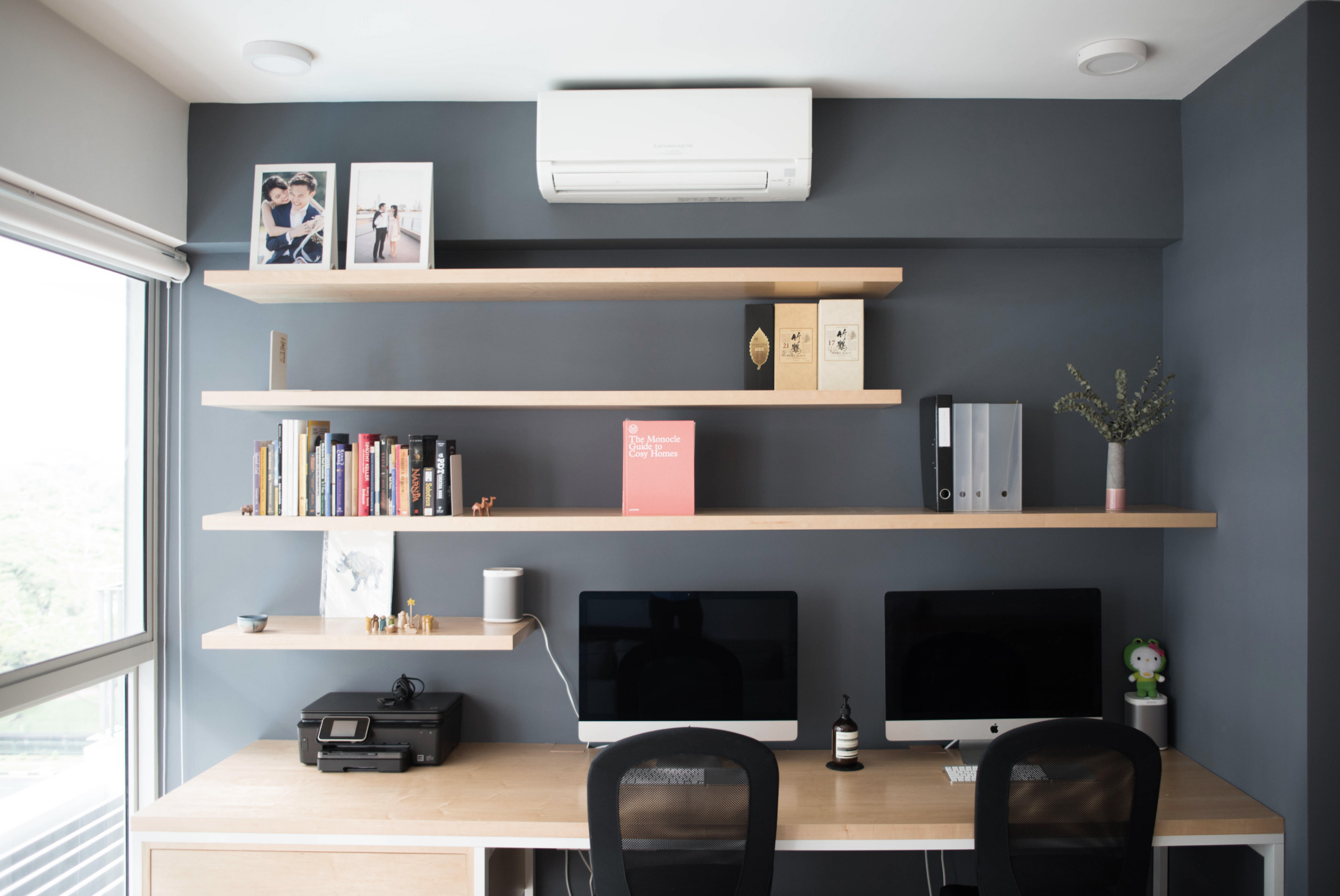 To tie in with the rest of the living space, timber was also used for the tabletop and mounted shelves. With natural light permeating this area, the result is a clean and cosy nook that’s conducive for work.
