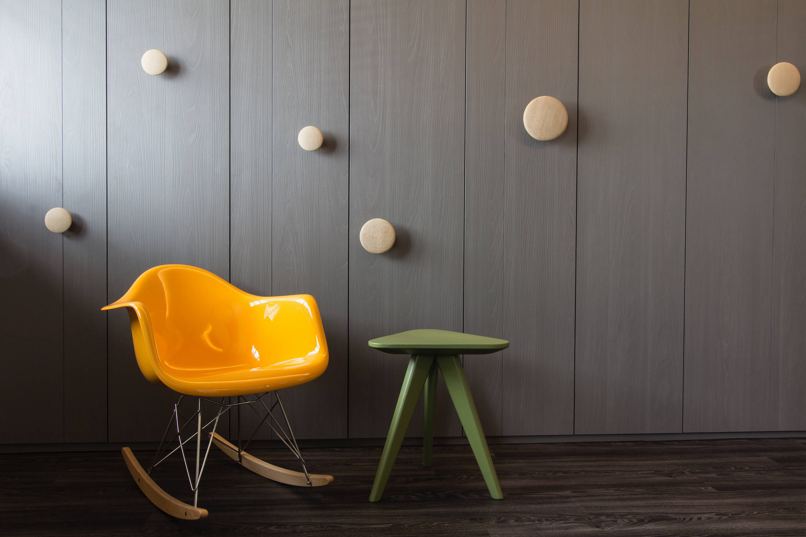 The walk-in wardrobe was created by merging the spare room with the master bedroom. The Dots hooks from Muuto add a sense of playfulness to the wardrobe space, and also serve dual function as clothing hooks and door handles.