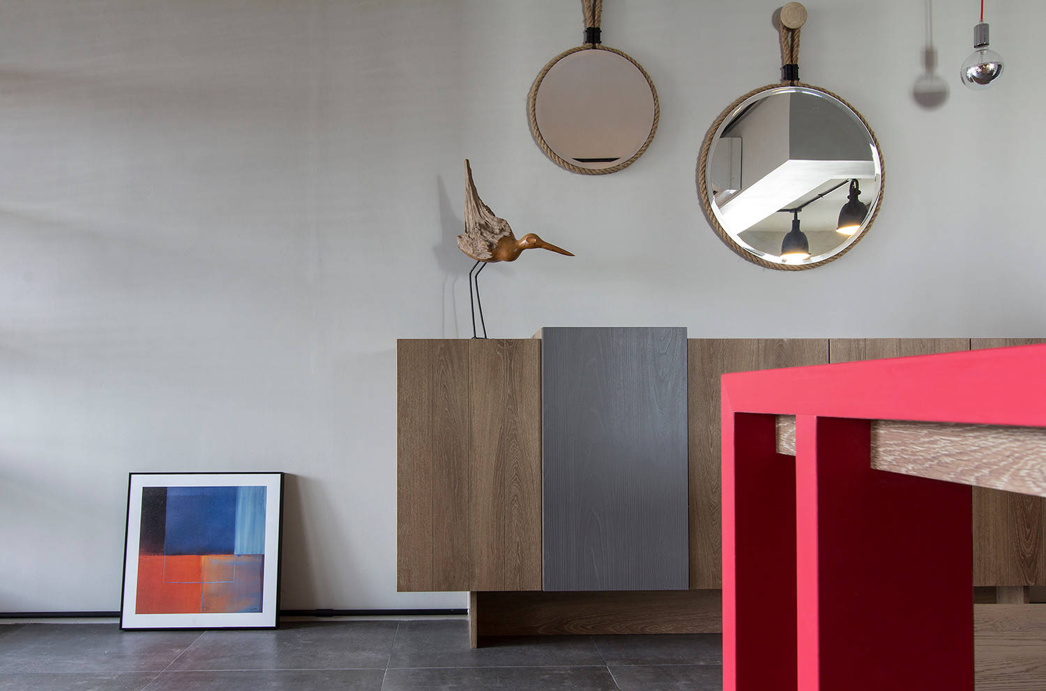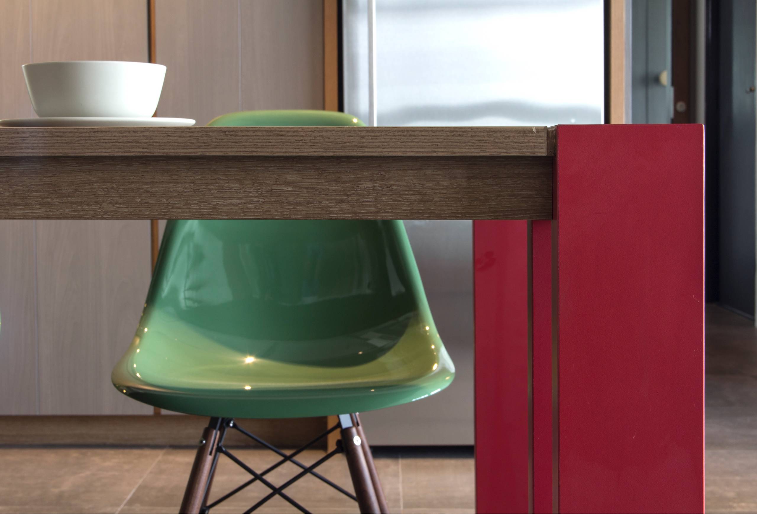 Giving the home a breather from the wood-and-stone palette are punches of colour, in the form of green dining chairs, a bright red frame end-detail on the dining table, and various artwork.