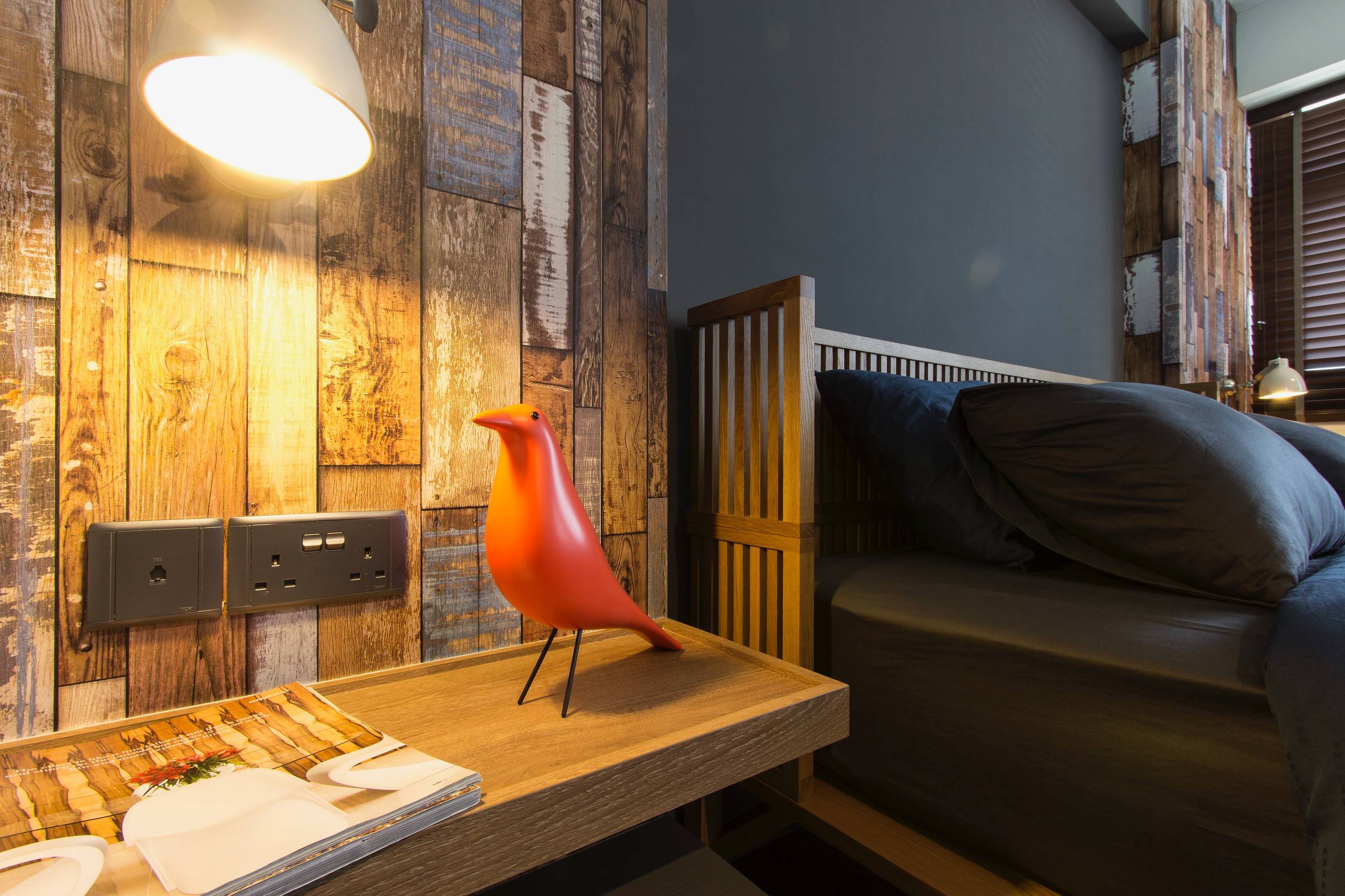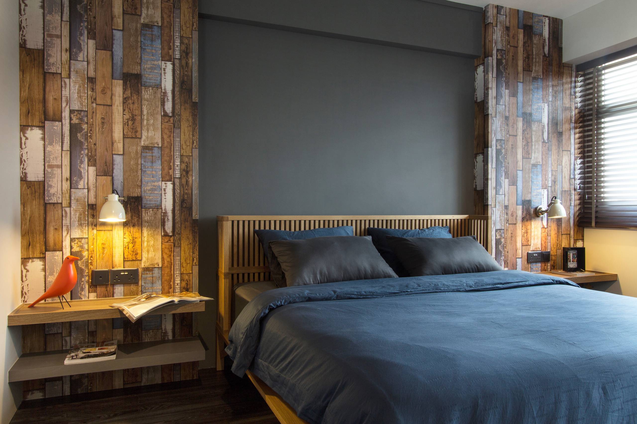 The minimalist bedroom spells quiet respite. The industrial look is still carried over here, with the trompe l’oeil wallpaper giving the appearance of a distressed wood patchwork on either side of the bed. “The decision to go with faux wood was simple: it made for easier maintenance,” Khu says. And instead of night tables, he opted for floating shelves to let the distressed wood motif stand out, while giving the owners ample useful surface to put their things.