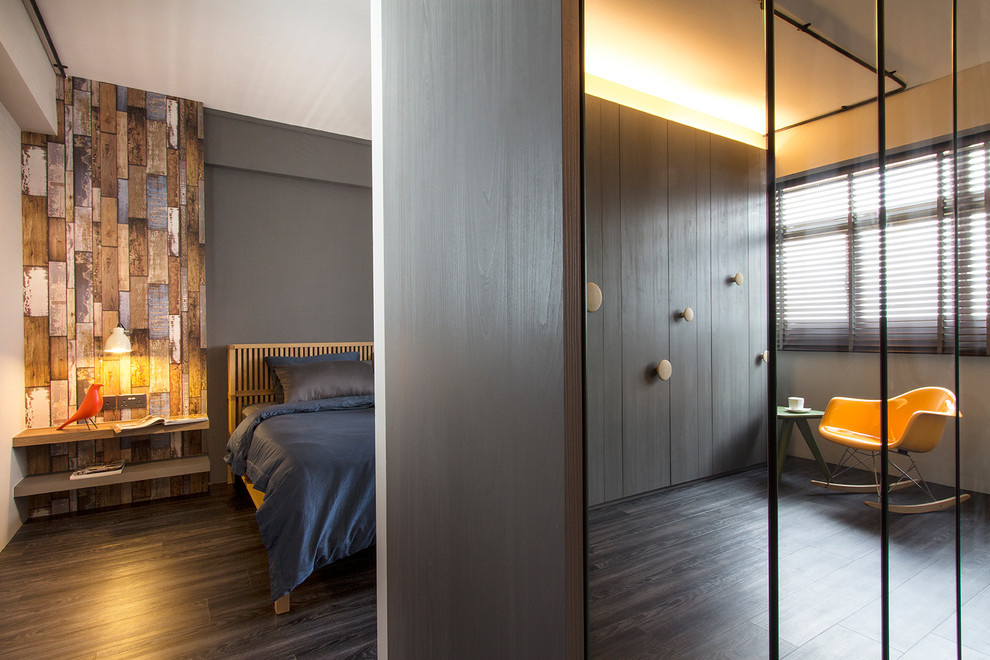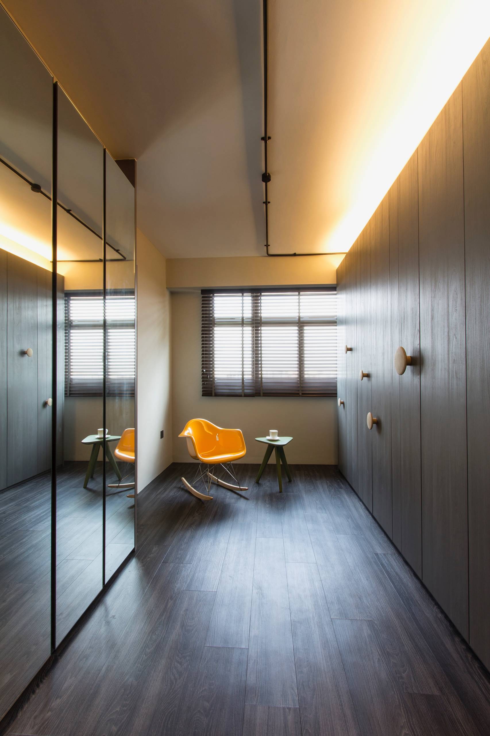 Khu capitalised on the use of mirrors in the hallway to visually expand and brighten the space. Aside from the bomb shelter door that was disguised as a full-length mirror (it’s actually a pivot door), a mirror was also fitted above the master bedroom’s new pocket door to add depth to the narrow space.