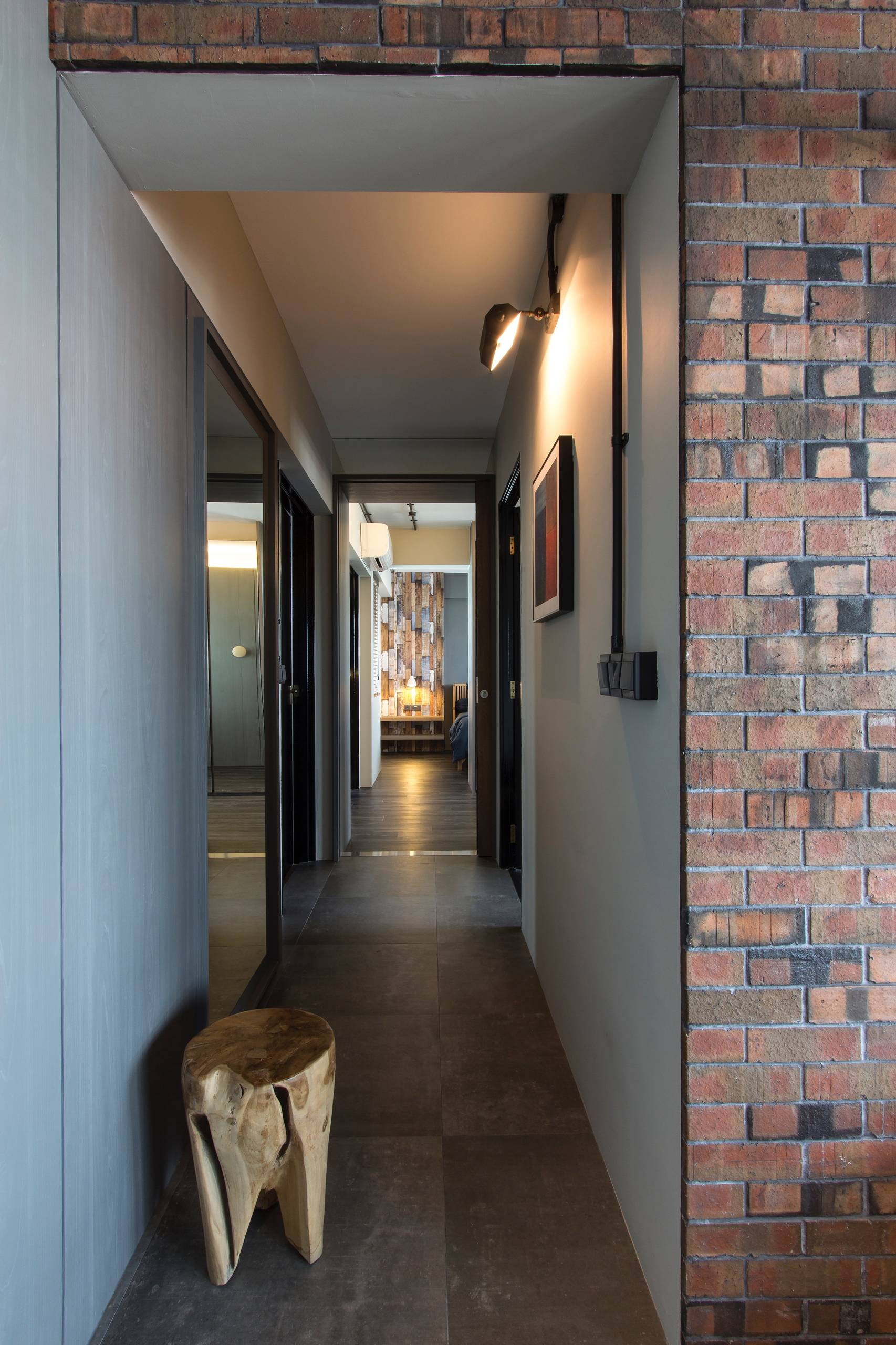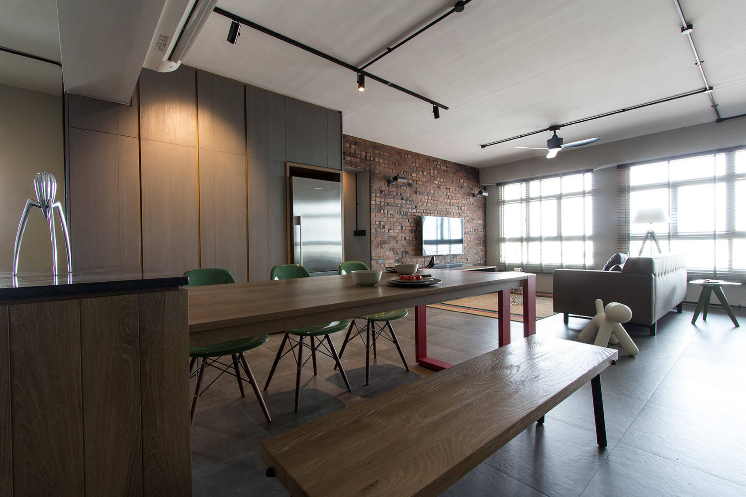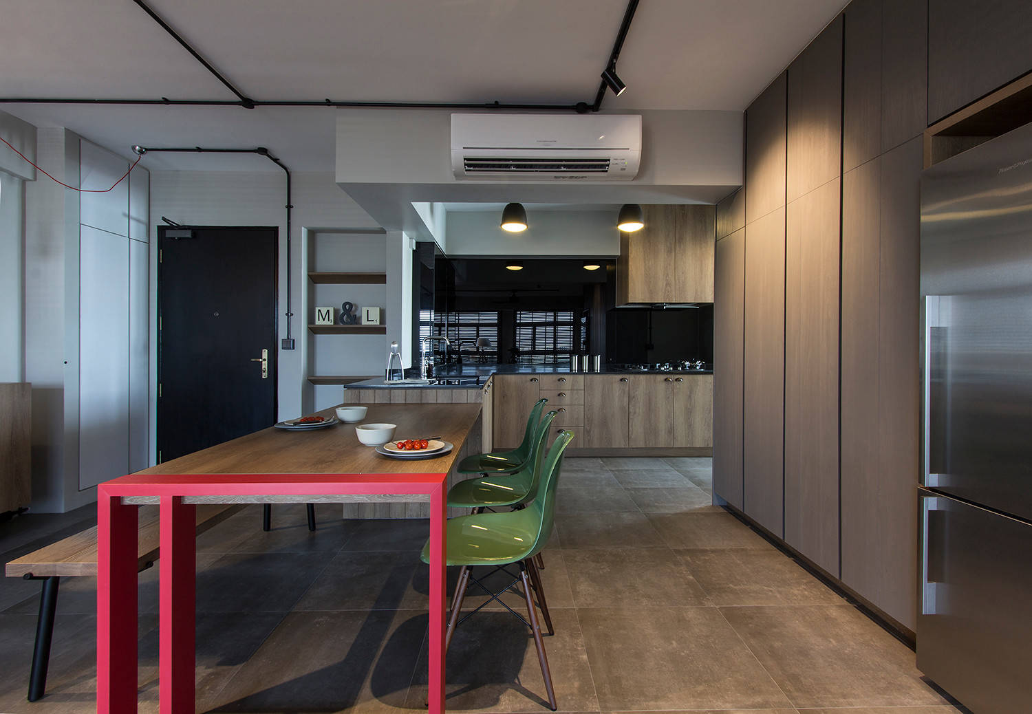 Home to a married couple, this five-room HDB flat draws inspiration from well-worn industrial warehouses, particularly New York industrial lofts, but balances the look with a controlled use of raw and unfinished details. “The husband actually likes the industrial style, but the wife finds it a bit too ‘raw’. We decided to have touches of colour, and some timeless and contemporary details, so it looks more chic and cosy,” explains Joey Khu of Joey Khu Interior Design.