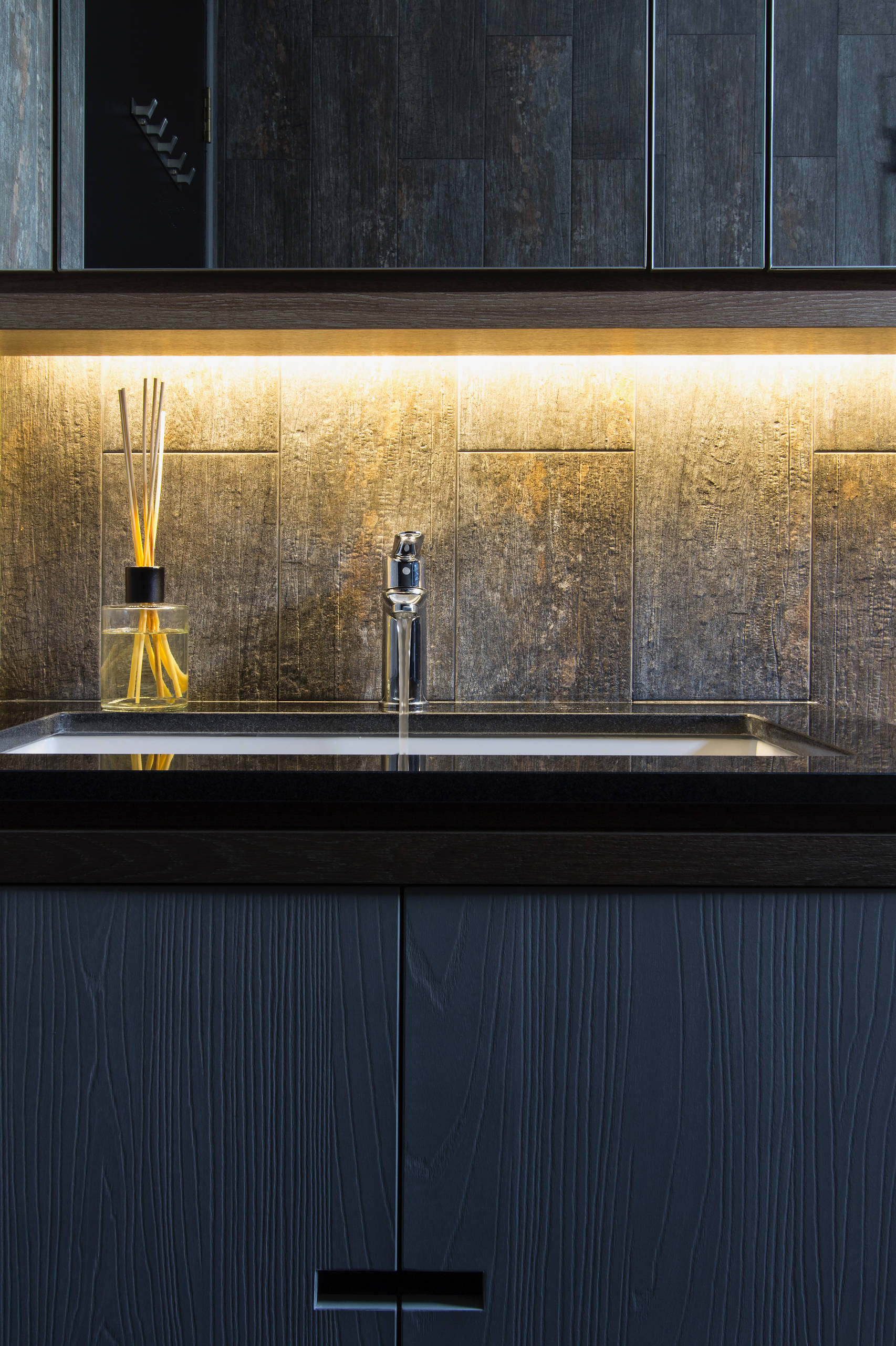 The bathroom rounds off the raw and rustic look, with pronounced woodgrain and stone-like textures highlighted by warm ambient lighting.