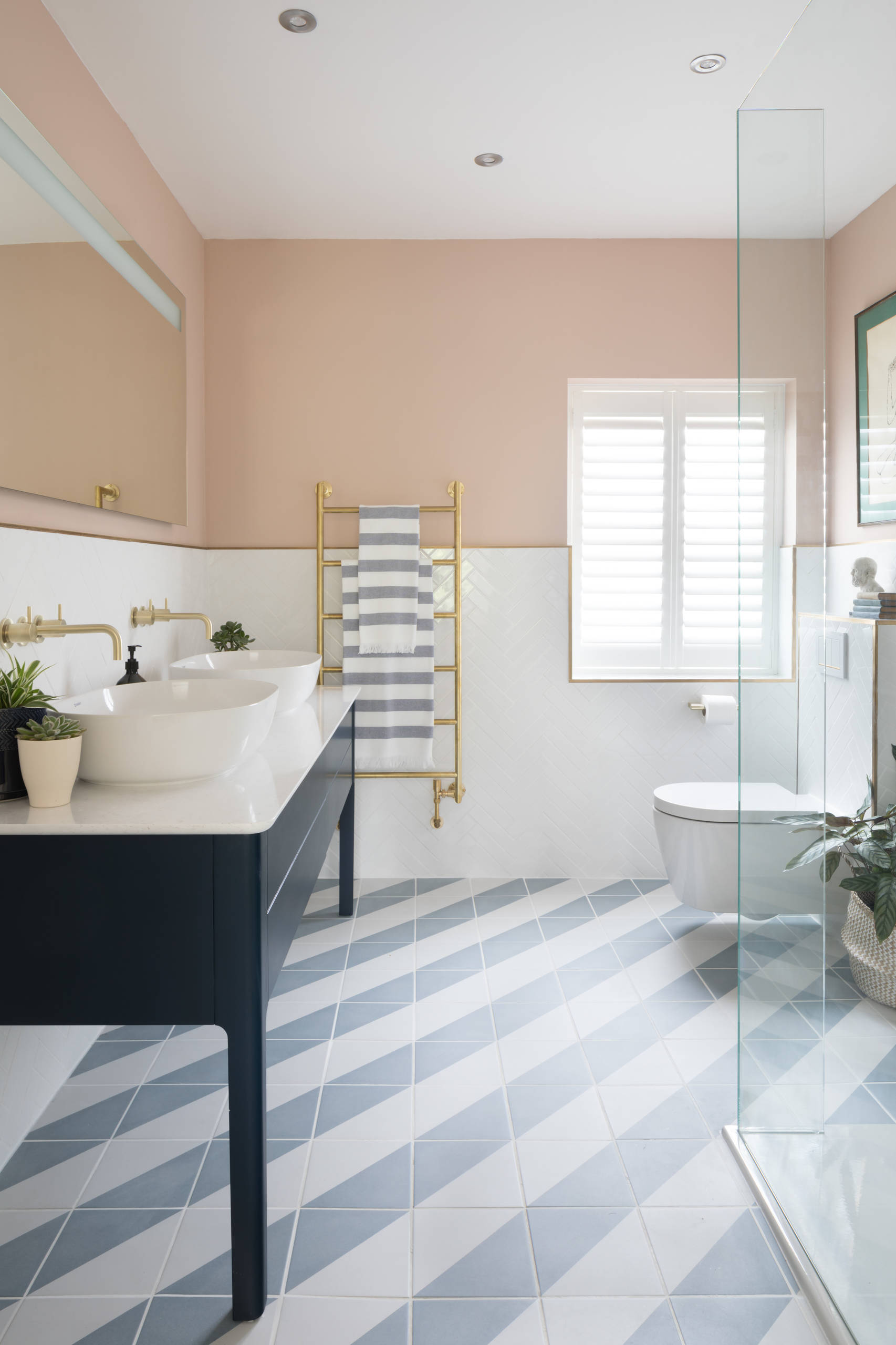 Here, the soft pink paint colour works beautifully with the brass fittings and dark blue vanity unit, while the trim is stylish brass – visible as a design detail but not shouty.