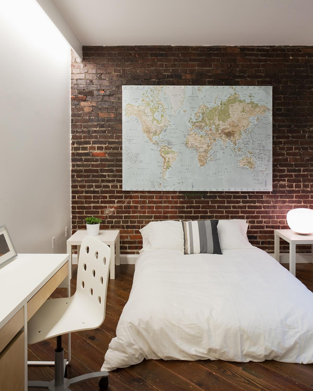 In a room with a long, exposed wall, the amount of brick can be overwhelming. But rather than changing the original colour, try breaking up the brick with art, furnishings or a mirror to give the eye a visual break while letting the texture peek through in smaller doses.