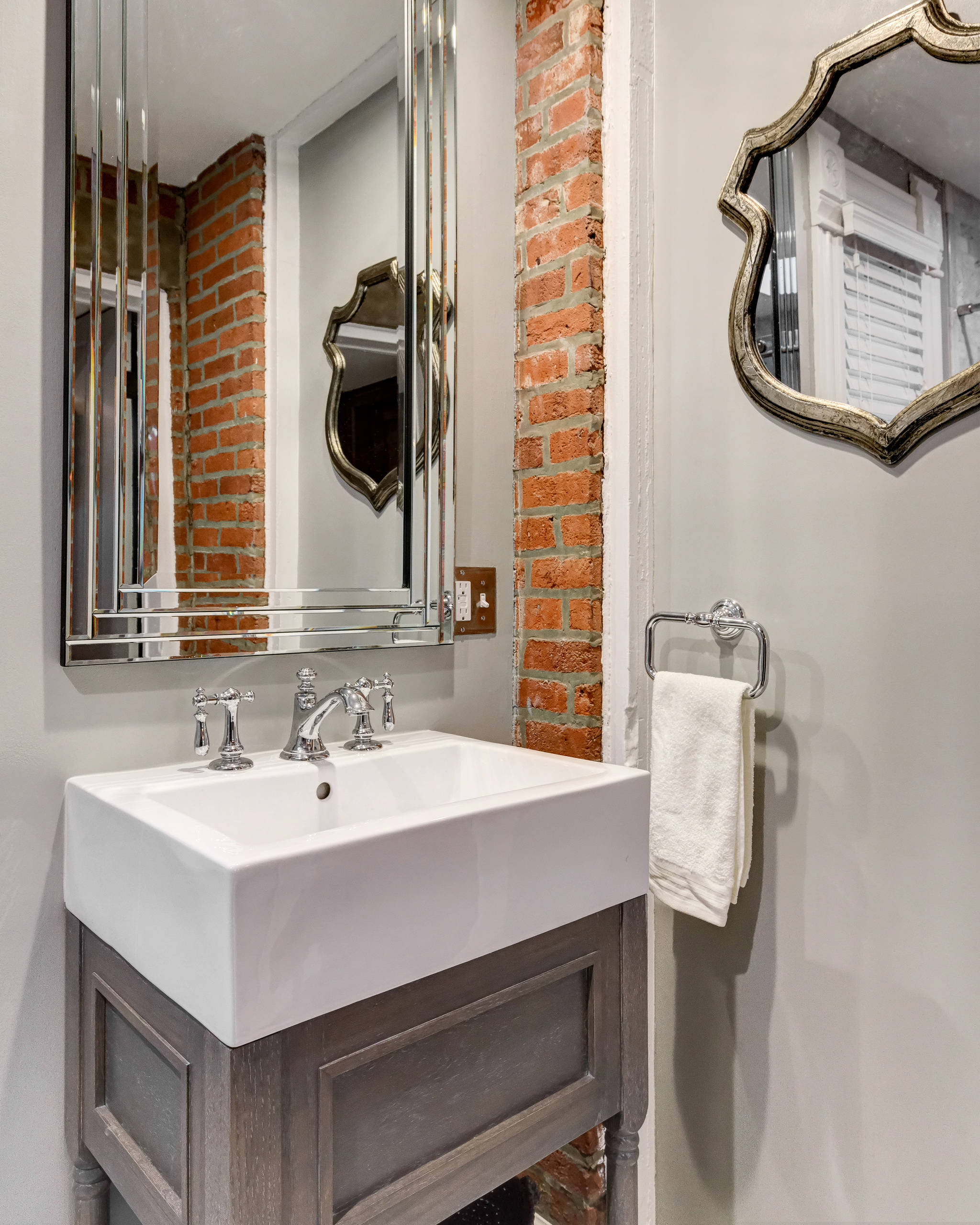Conversely, in a smaller space or where less brick is exposed, a mirror can help brick visually repeat so it seems more present in the full space and appears to be sprinkled throughout instead of the room’s looking lopsided.
