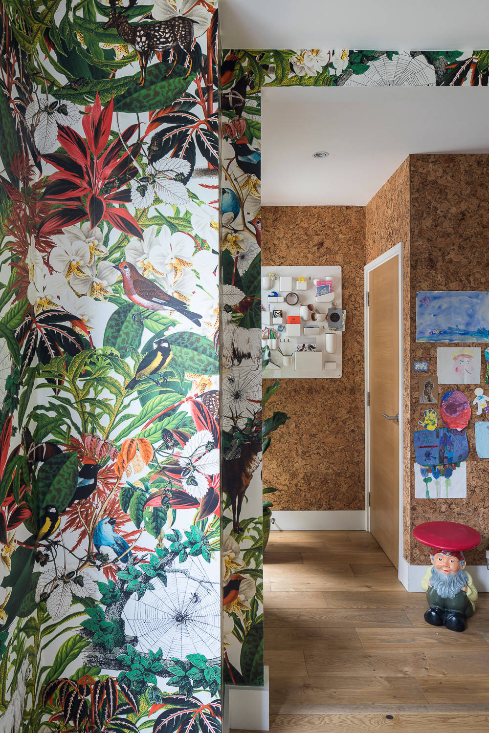 How about this for a creative way to cover the walls? The bold wallpaper leads through to a new area, clearly marked by a corridor lined in cork. The two contrasting surfaces add character to the space and help to demarcate the zones brilliantly.