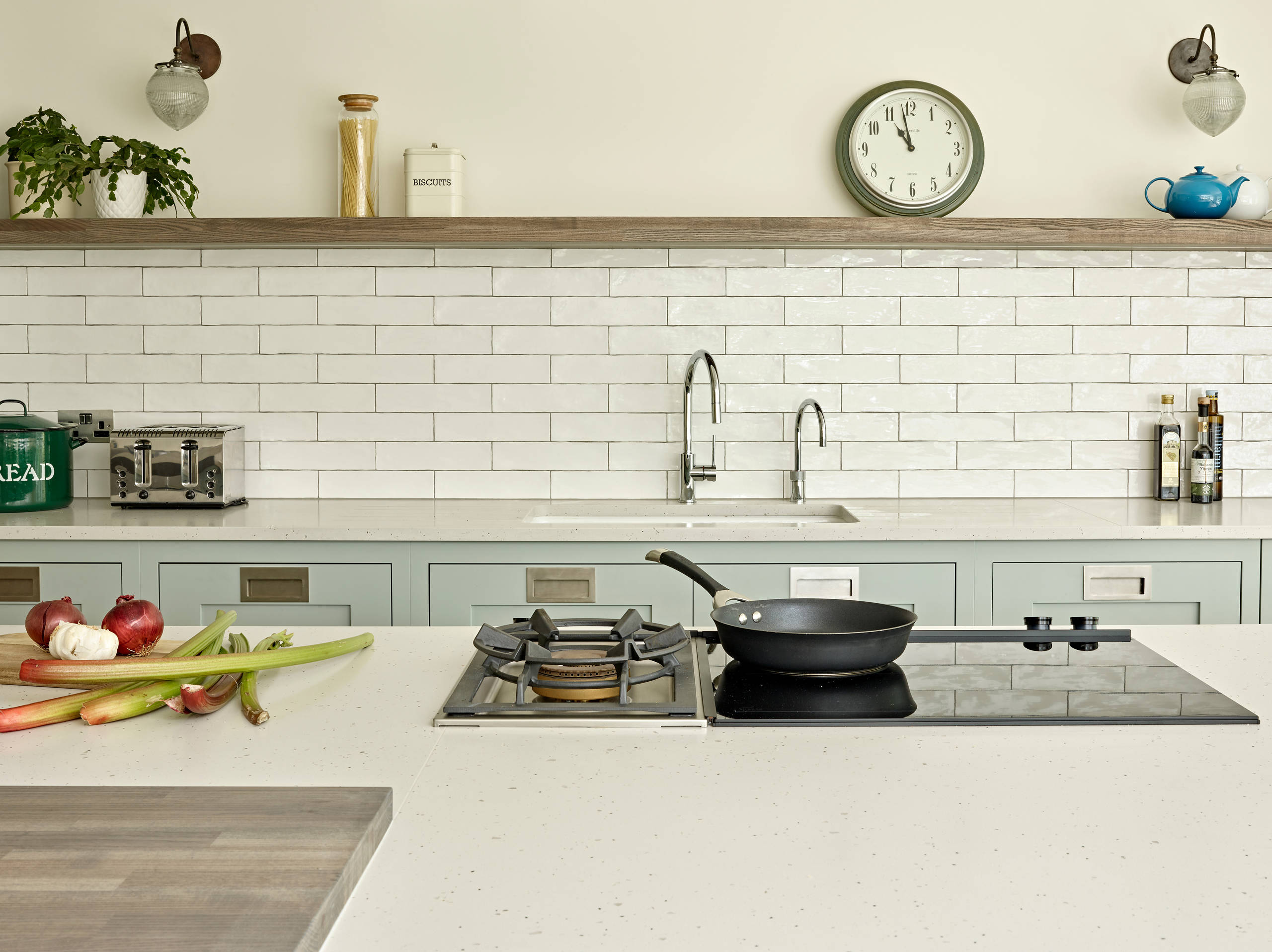 A modular hob with gas and induction sections sits alongside a sink where the owners can wash fruit and vegetables. On the back wall is another sink for washing-up that also has a boiling-water tap.