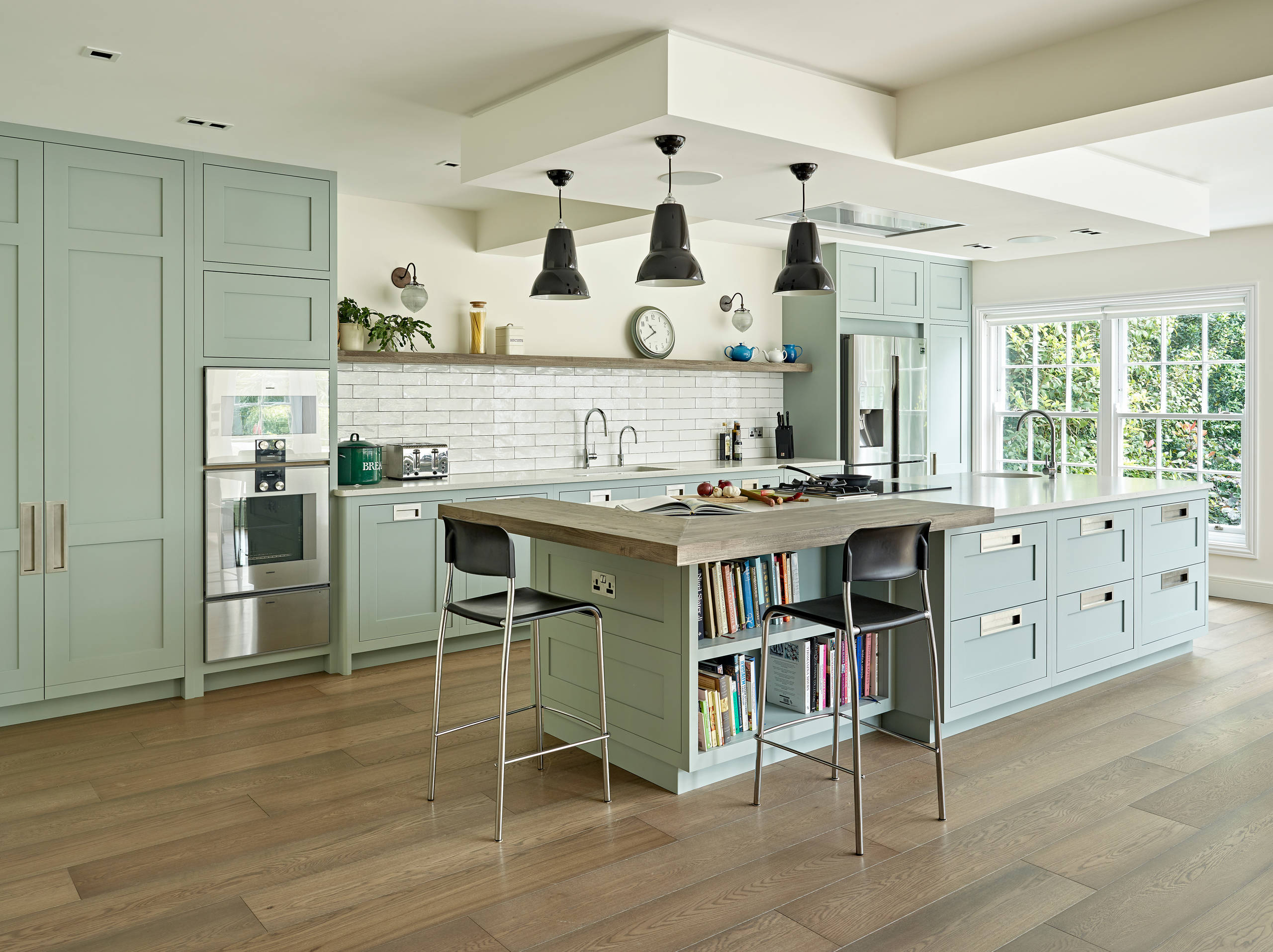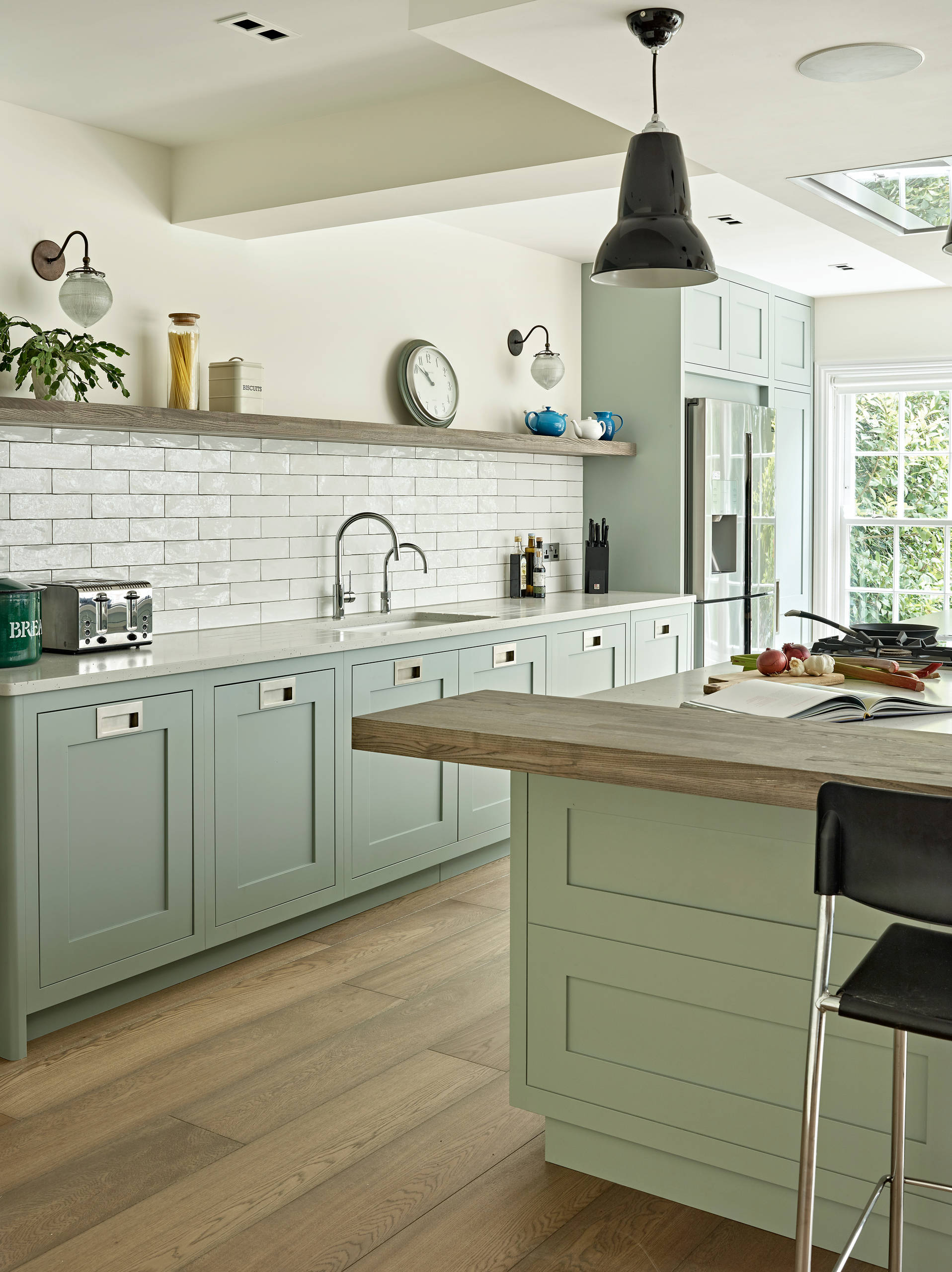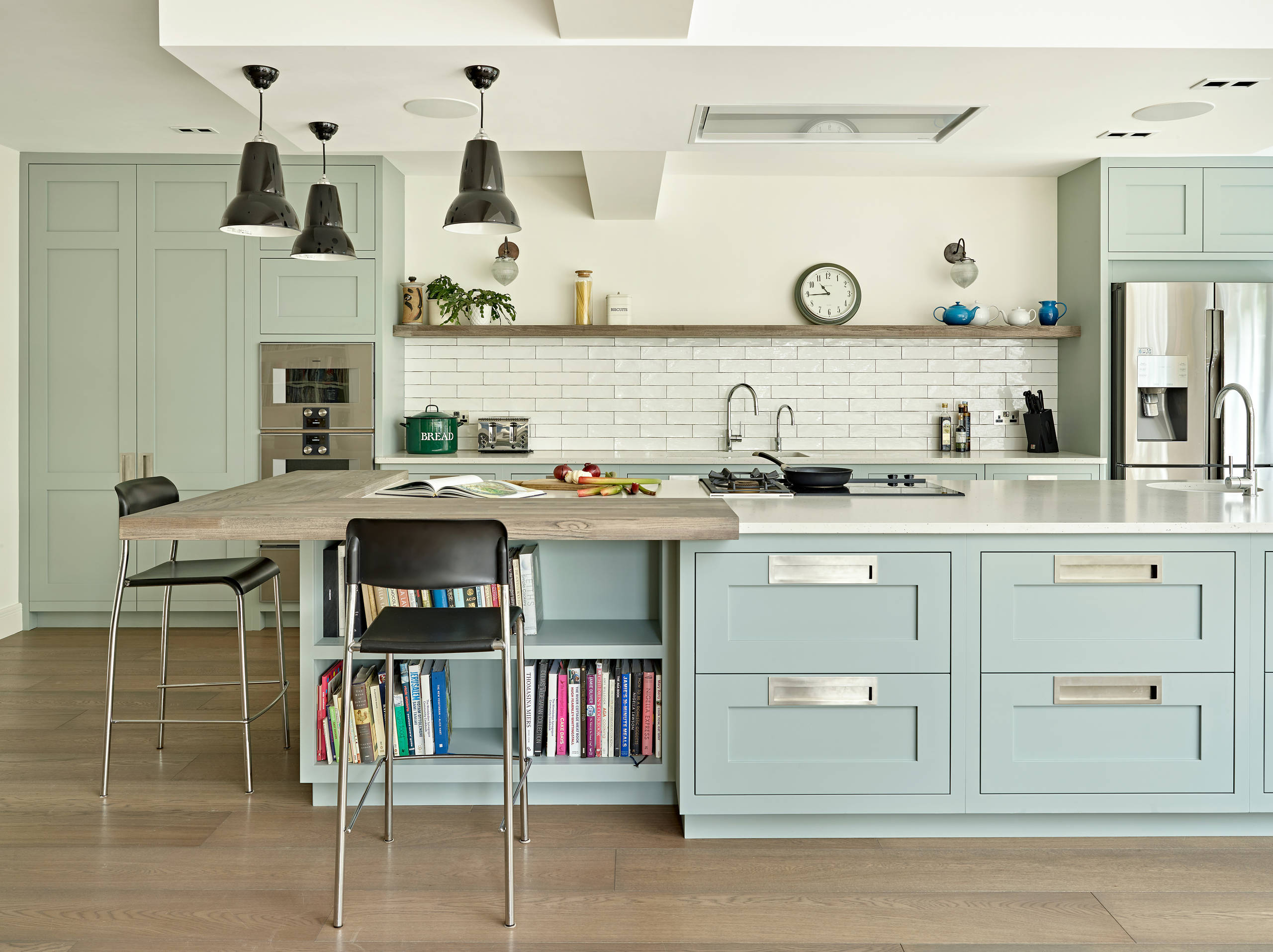 Cabinets painted in Museum, Mylands. Quartz worktop, Caesarstone. Prima Heart Ash breakfast bar and shelf, Spekva. Main cast-iron sink, Kohler. Boiling-water tap, Quooker. Preparation sink, Shaws. Taps, Gessi. Cooking appliances, Gaggenau. Extractor, Falmec.