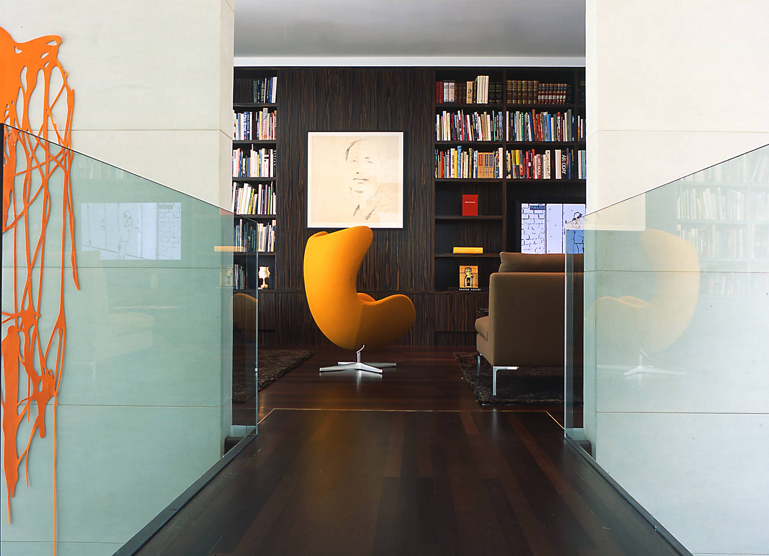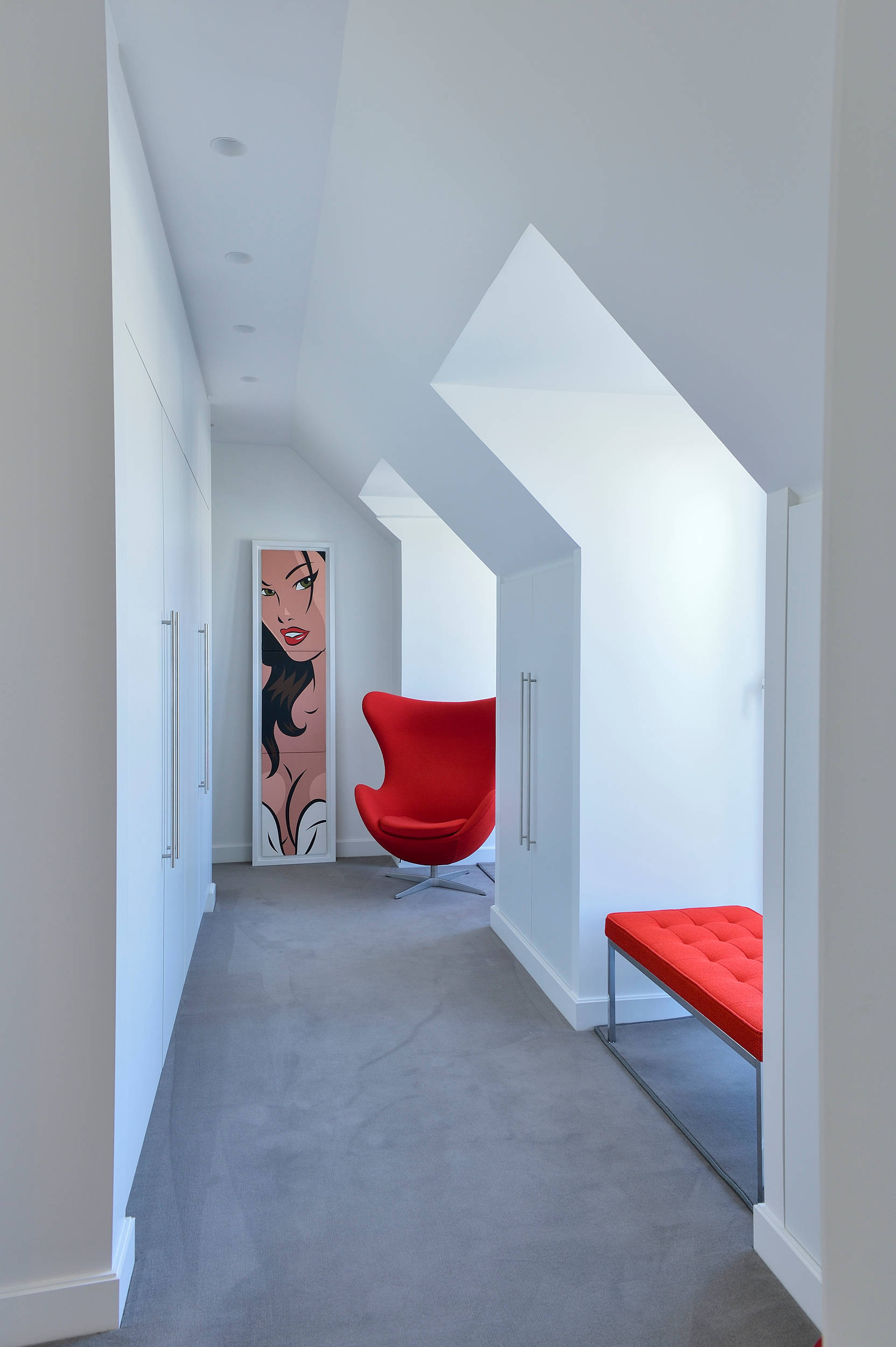 This classic bright red Egg chair leaps out in this pristine hallway. The vivid colour also complements the artwork, and even makes the chair an art piece in itself.