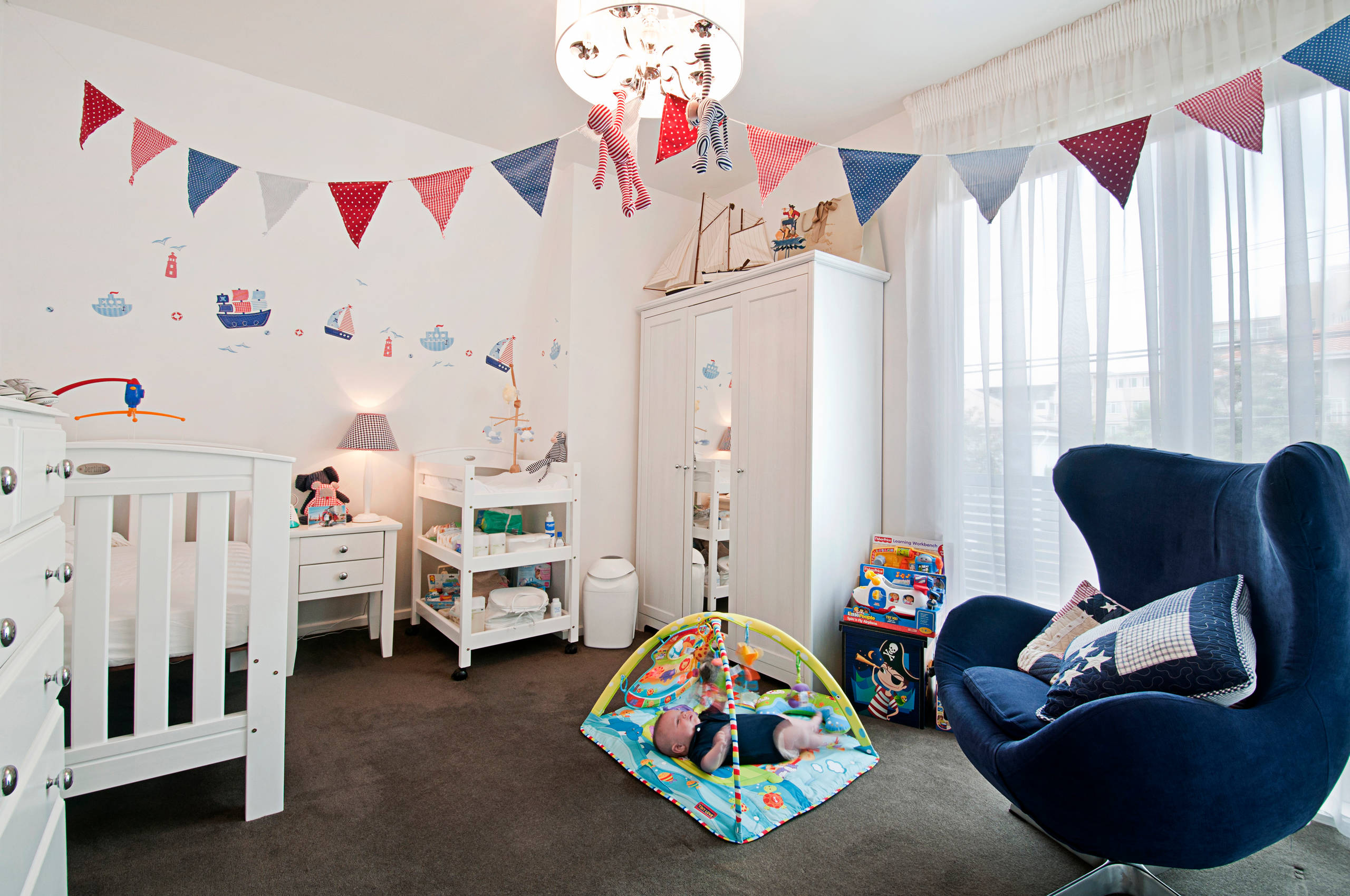 A nursery won’t be complete without a comfortable lounge chair for parent-and-child cuddling, and this Egg chair certainly fits the bill in this little boy’s room. The midnight blue chair, matched with equally cosy cushions, harmonises with the room’s blue, red and white colour scheme.