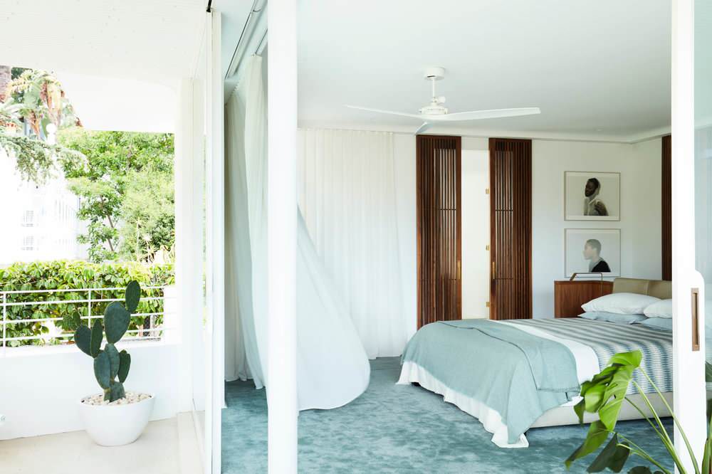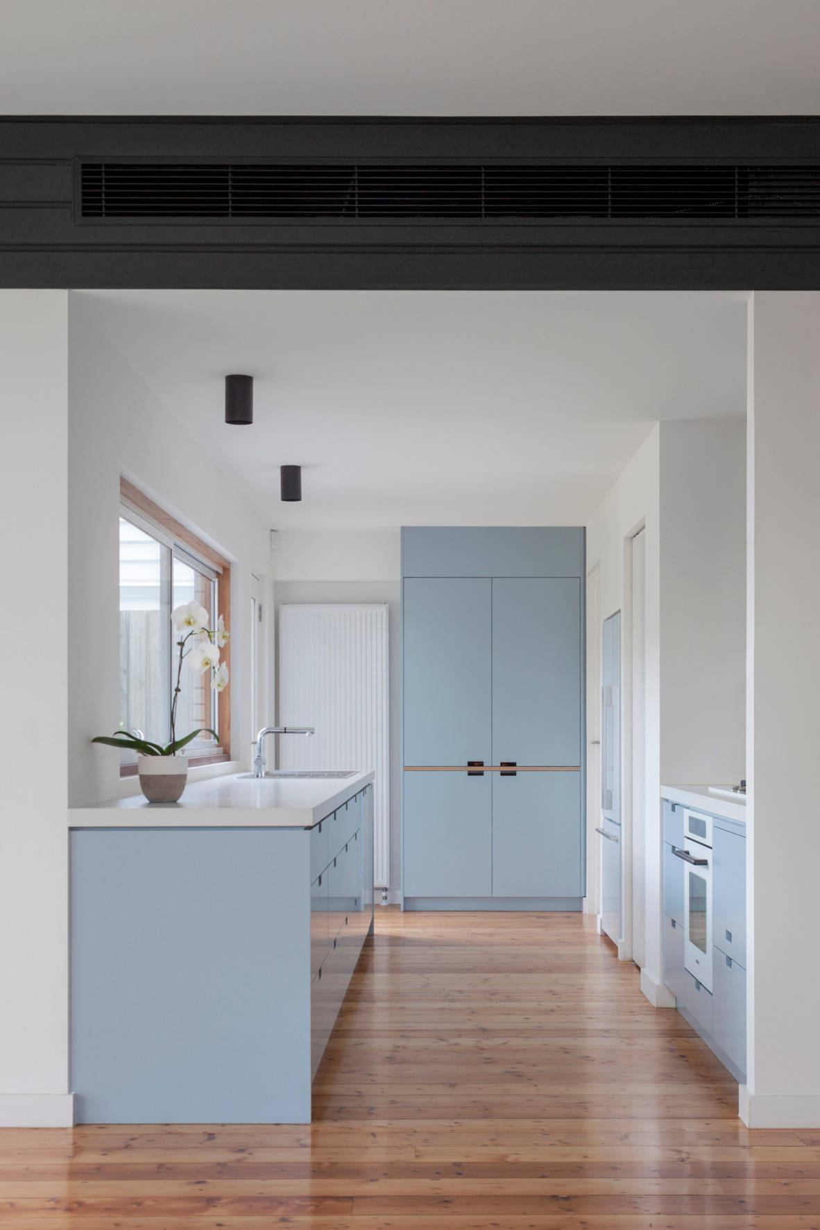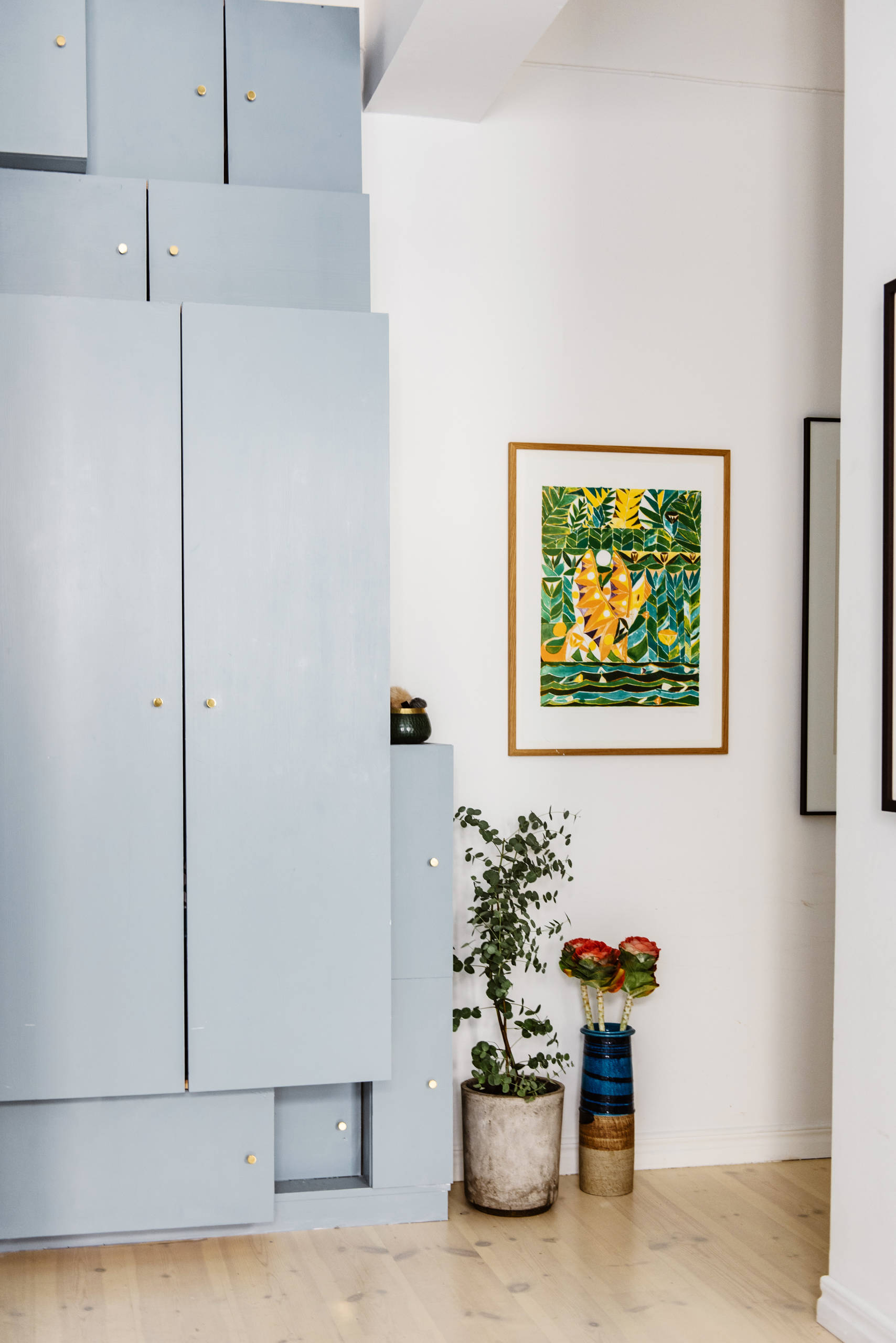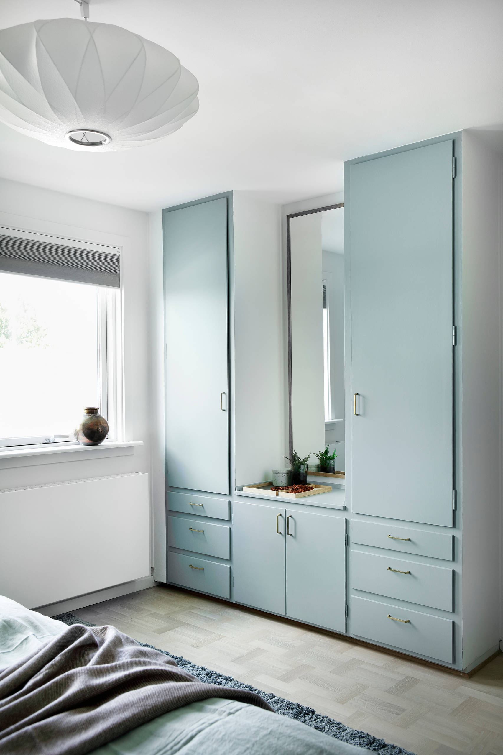 …Here’s the light blue cabinetry opposite the bed in a shade that flirts with teal.