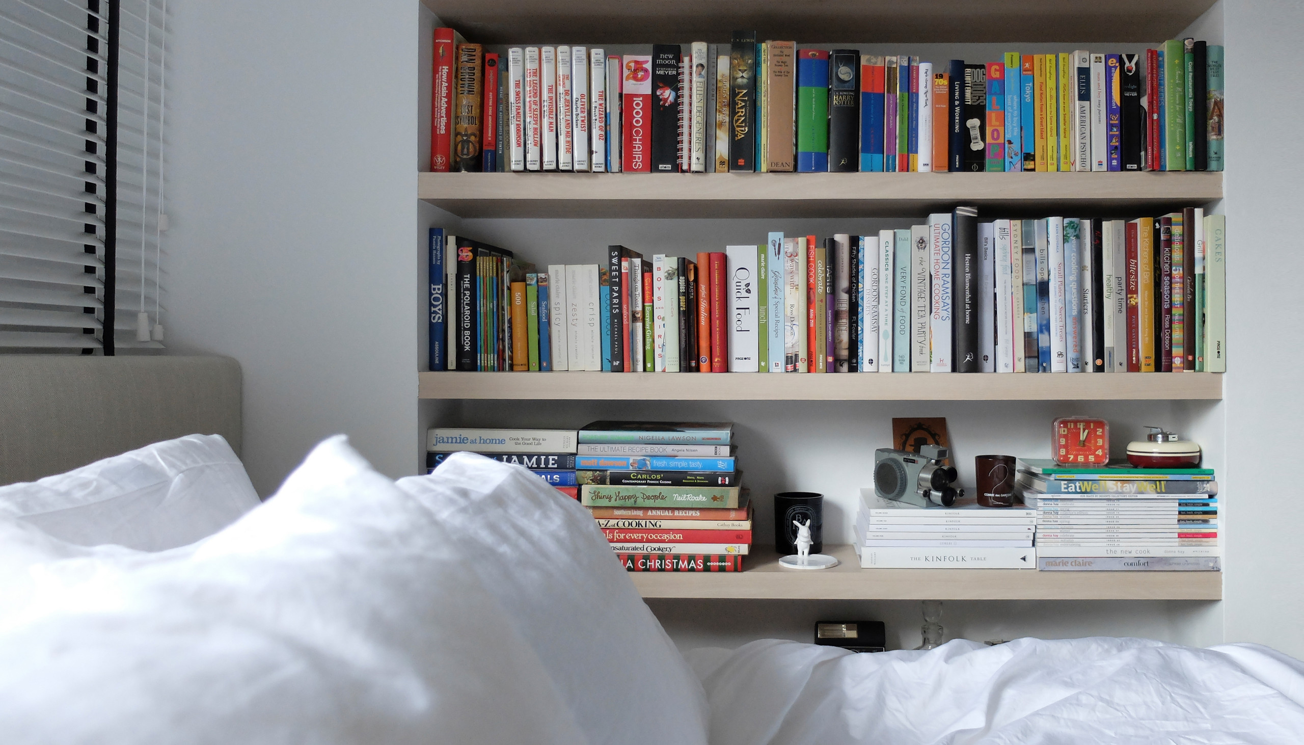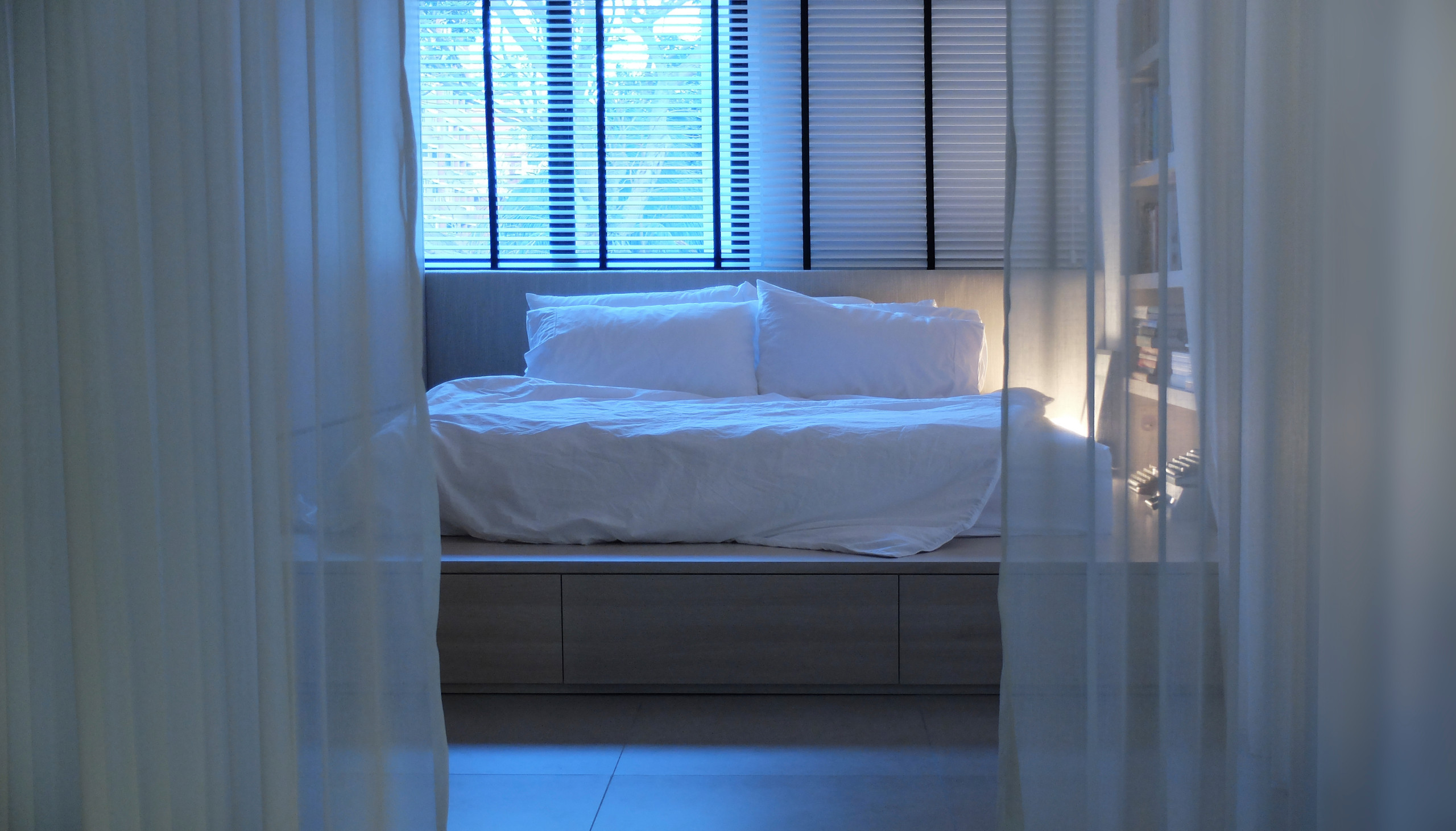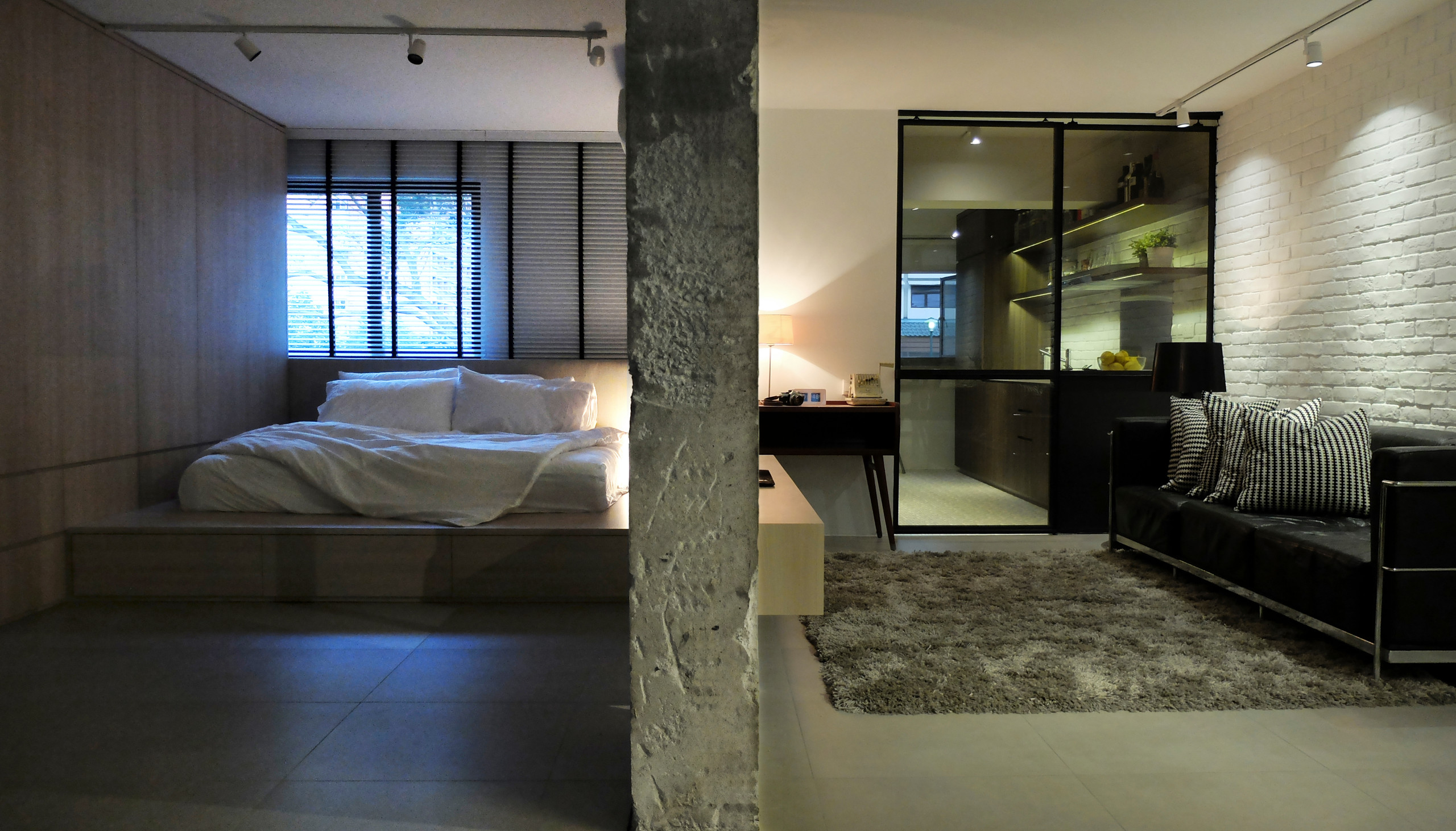 As the unit came with the existing off-centre window, the team installed venetian blinds to “balance” the headboard wall.