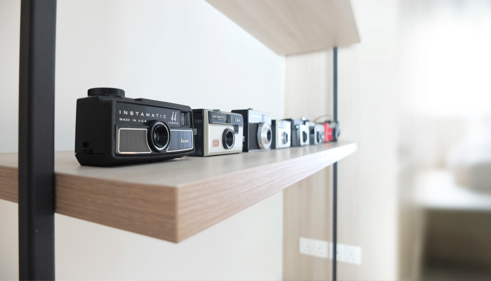 A work desk-cum-display area is slotted between the wardrobes. More vintage items such as the couple’s collection of old-school cameras and a retro swivelling armchair add personality to this area.