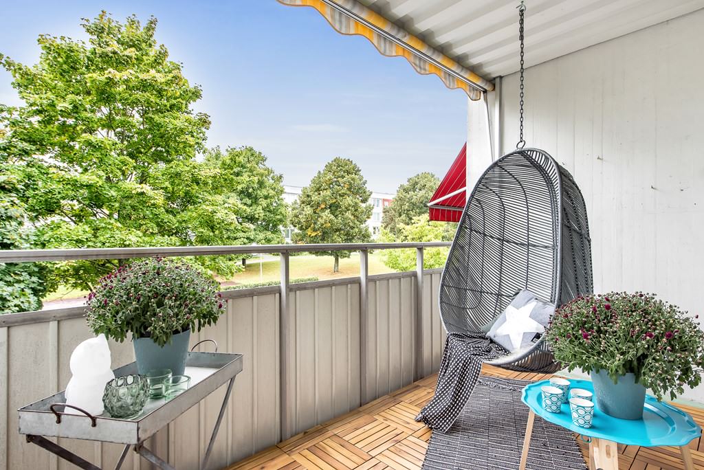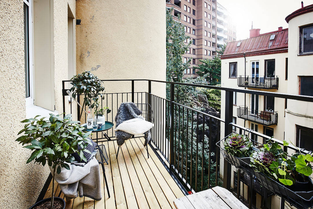 Here’s another small and narrow Swedish balcony, albeit with a more lush and charming view.