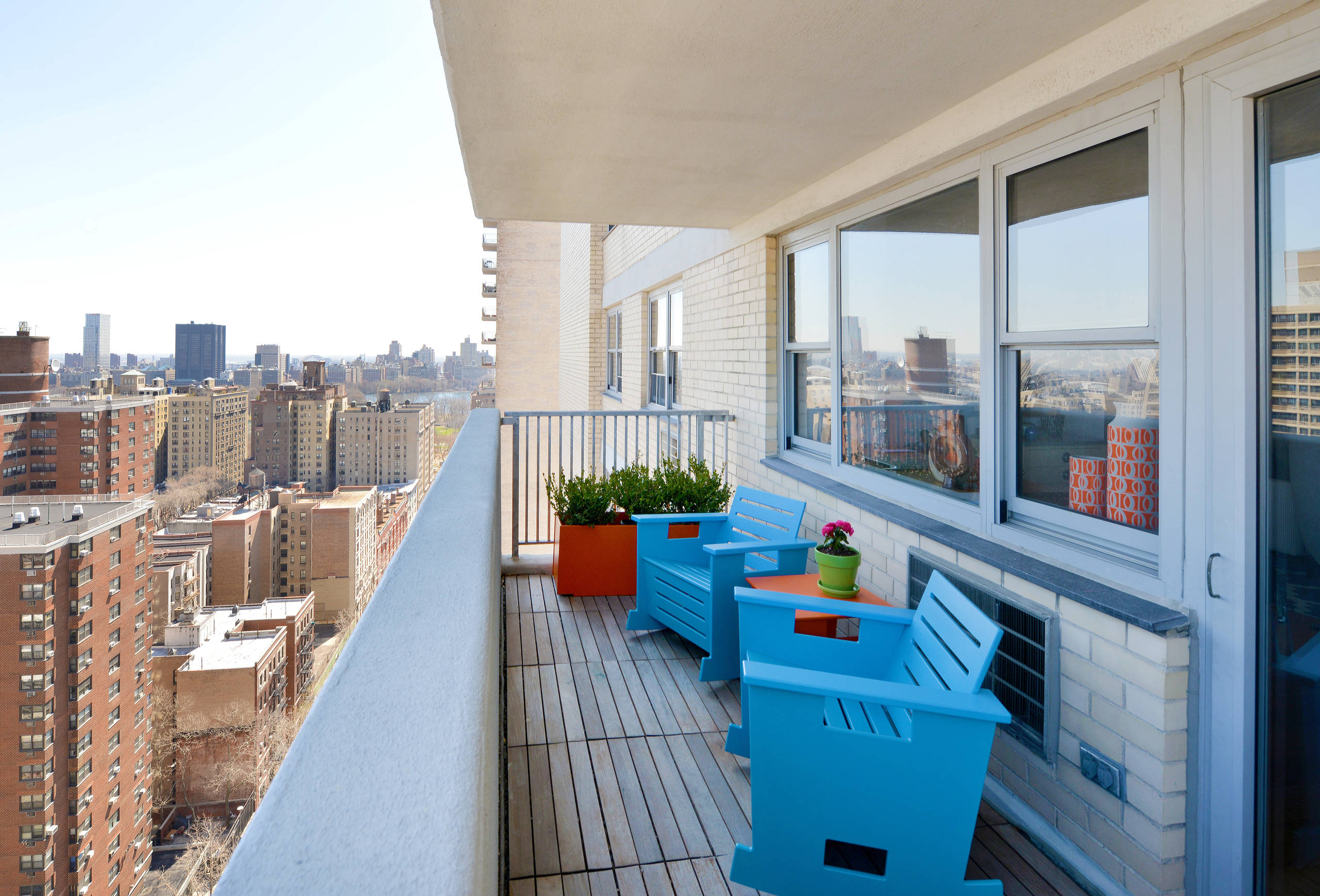 A bold splash of blue paint on these outdoor rockers enlivens this narrow New York balcony. The wood plank material of the decking as well as the chairs adds a contrasting country charm to the city view.