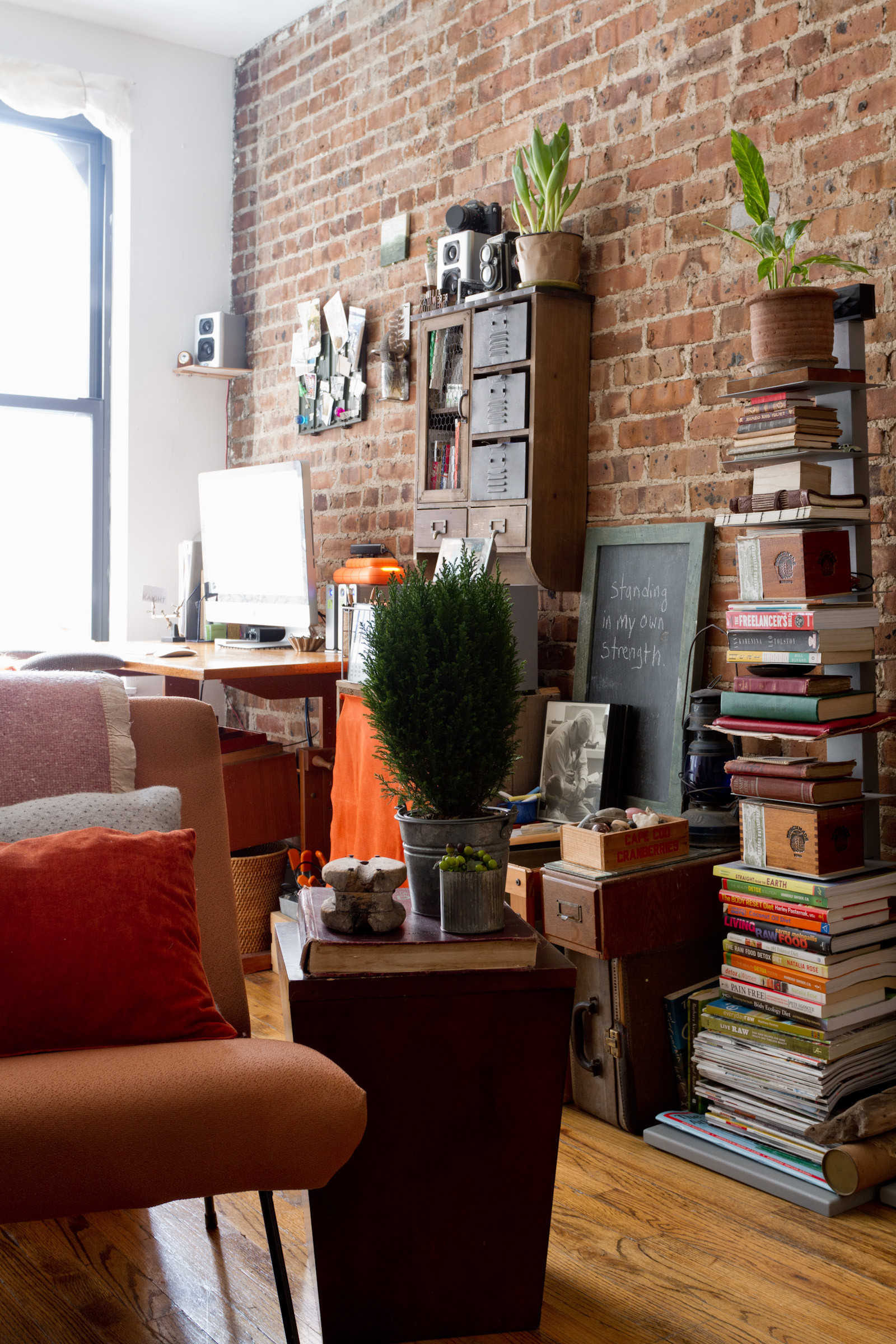 In decorating her studio, she was inspired by both New York City and rural Chilean Patagonia. She wanted to create an urban refuge but was also drawn to rough woods, thick wools and warm colours, which were naturally suited to the apartment’s existing brick wall.