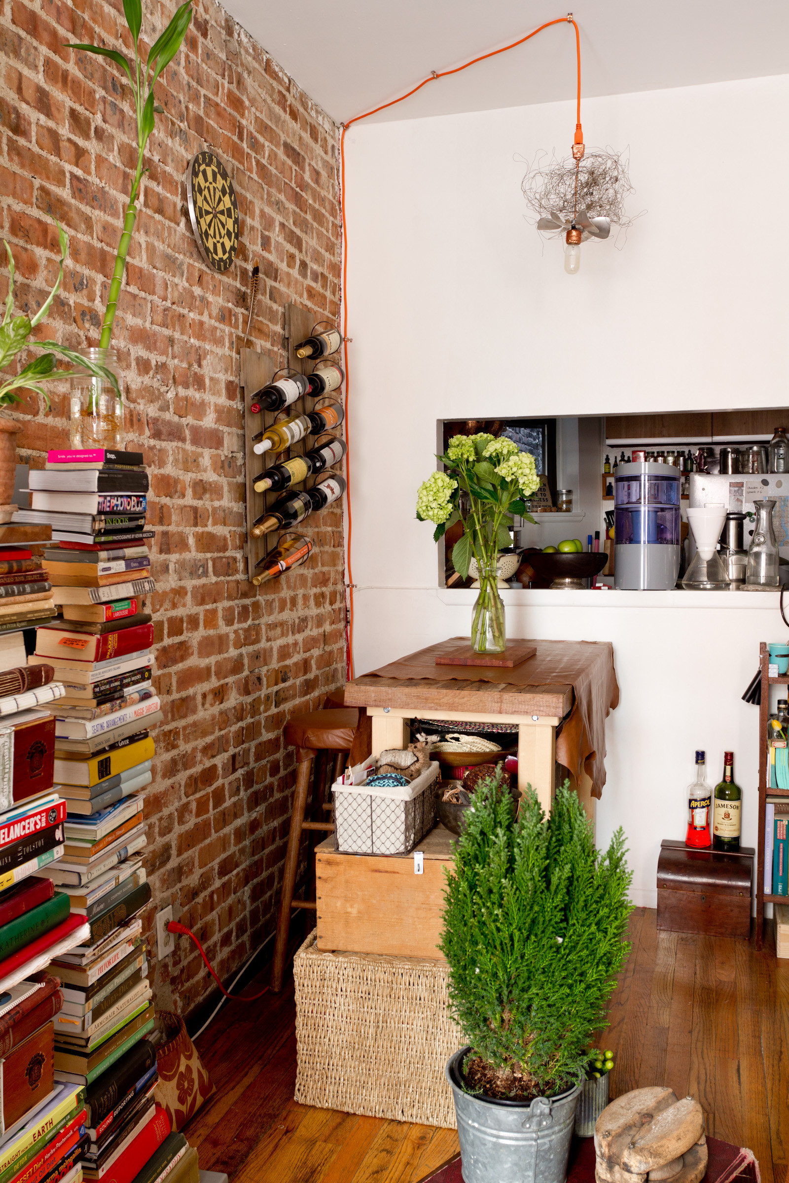 “I have always loved how displayed wine looks,” she says. “Finding a way to showcase it on the wall behind my butcher block table seemed like a good way to help define it as the dining area.”
