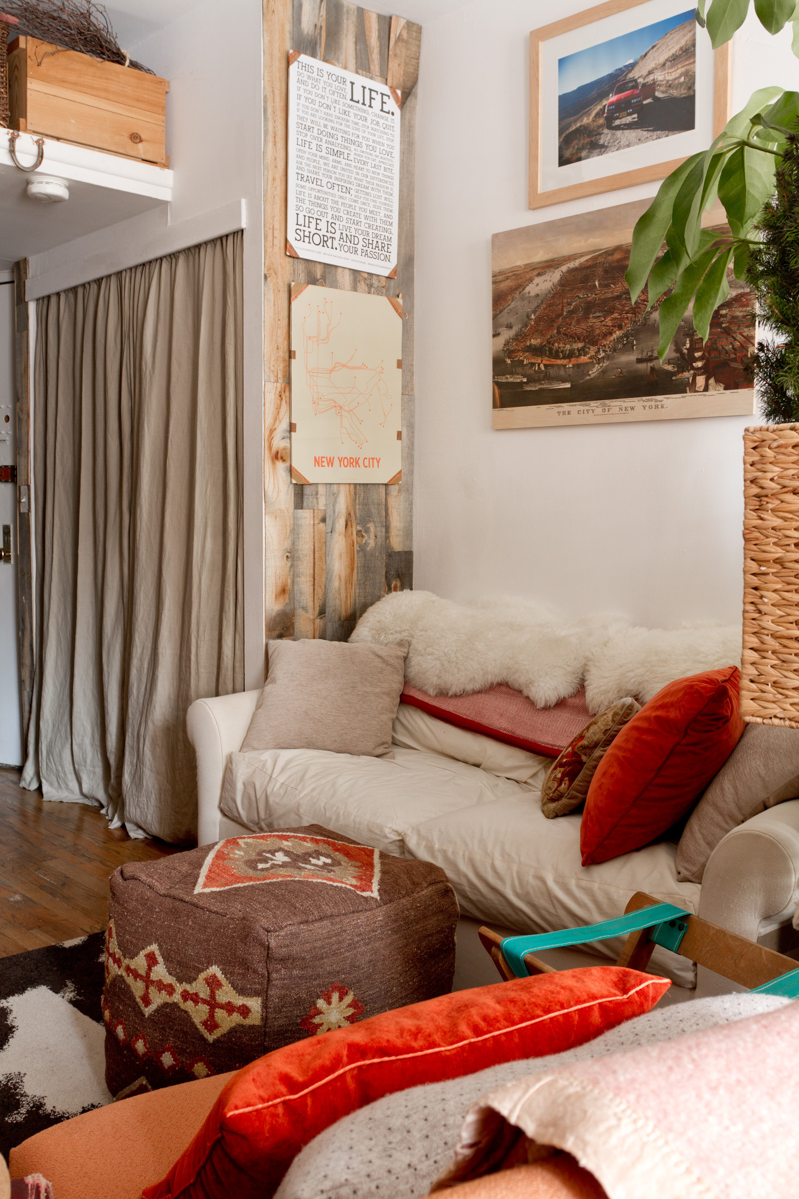 Her only closet, once outfitted with sliding doors, is now dressed with a linen curtain that hangs from a metal tension rod. The wall space adjacent to the sofa is covered in Stikwood to give it rustic appeal.