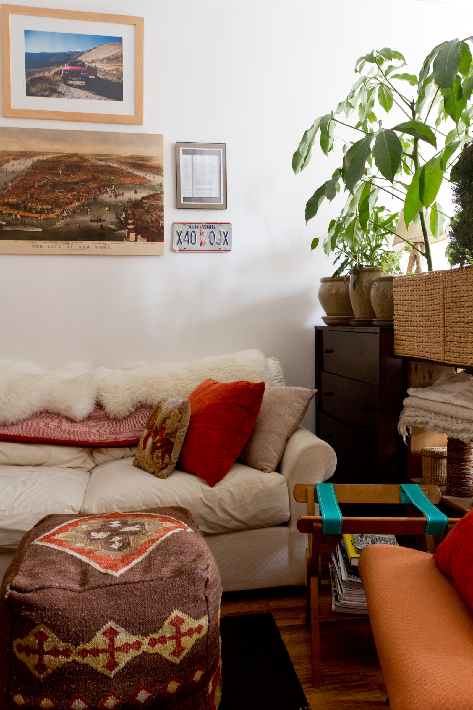 Kammerer’s dresser and a few potted plants act as a divider between the living and sleeping areas. The luggage rack she uses to store magazines and books was passed down from her grandparents.