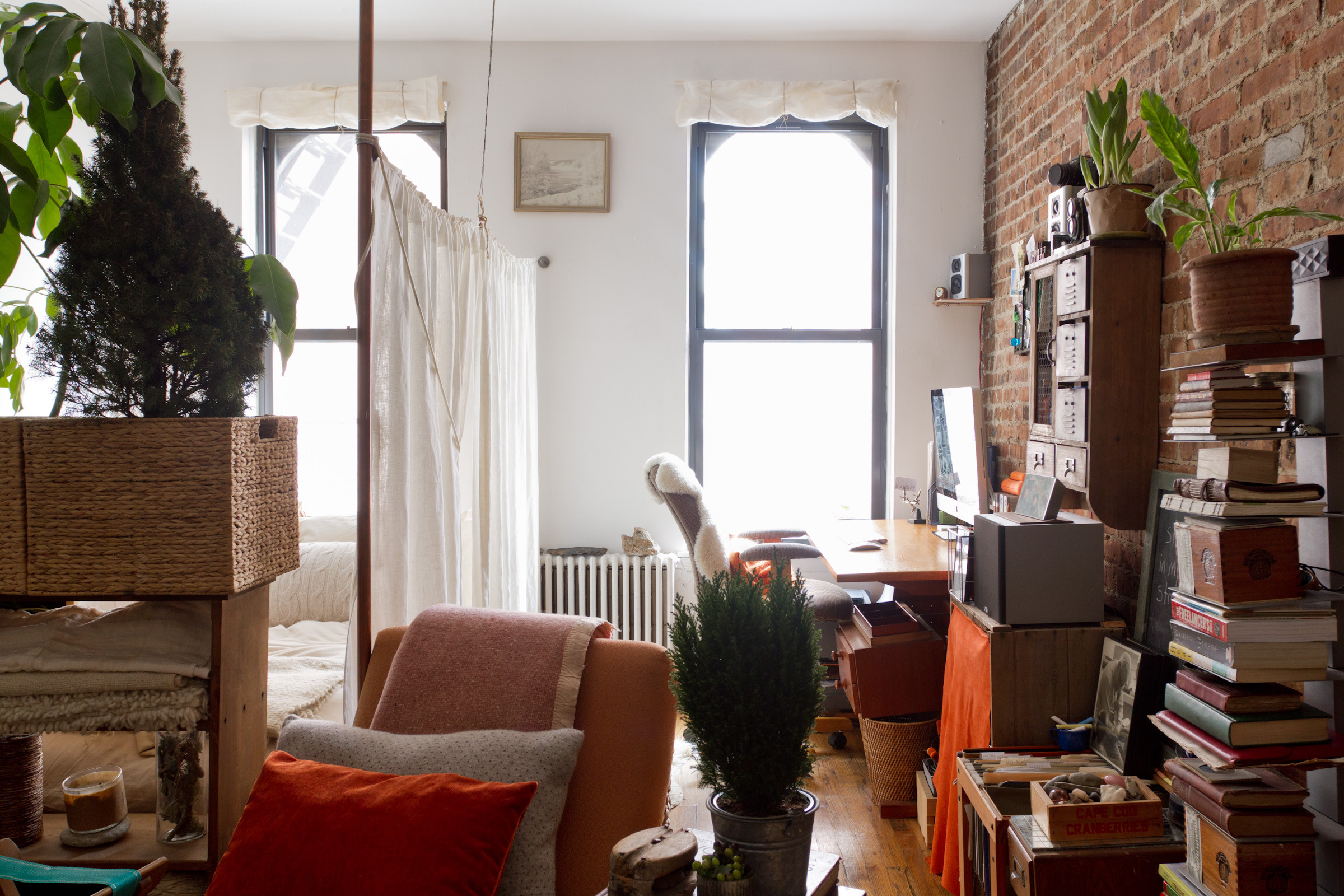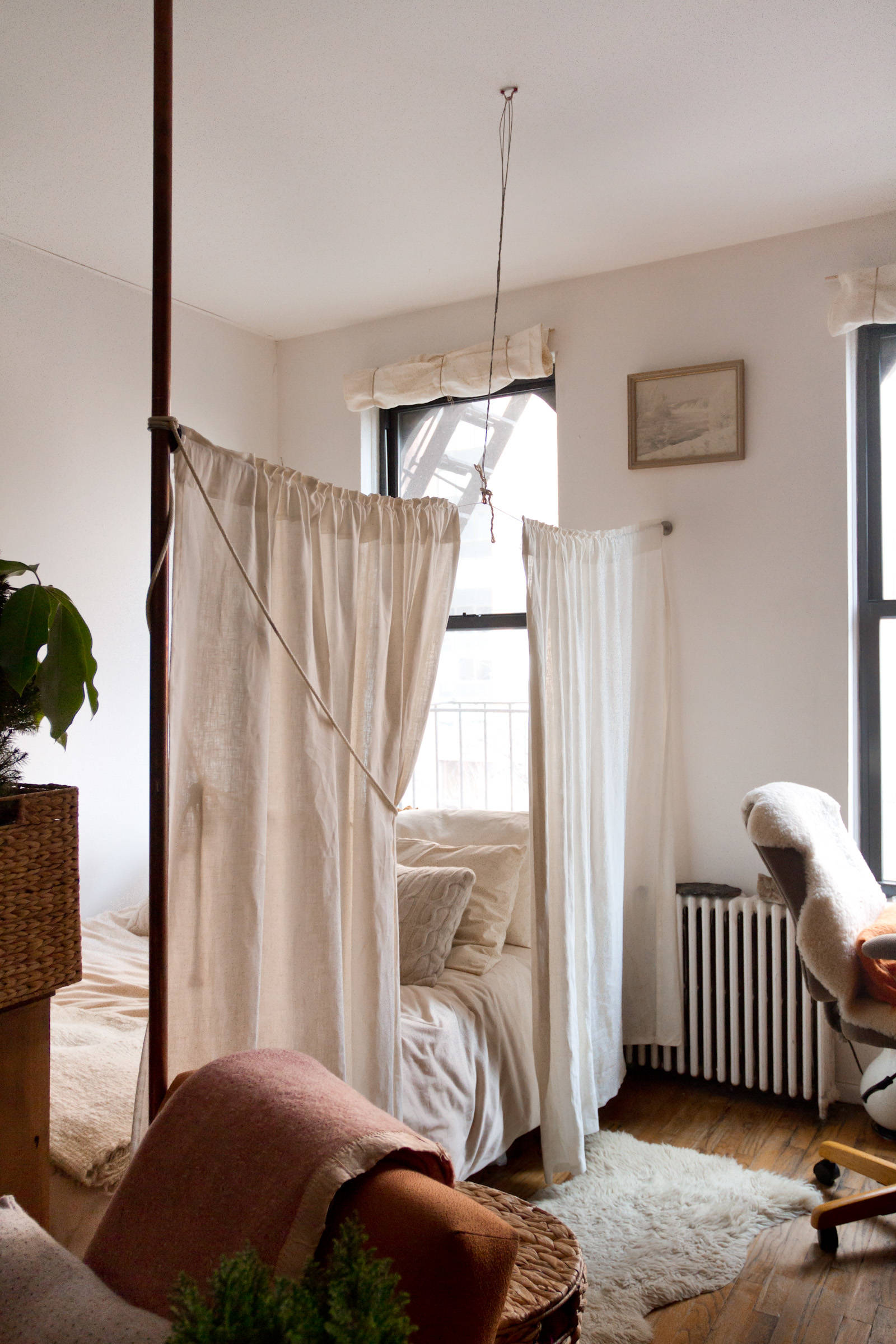 With the help of her landlord, Kammerer created a bedroom area by affixing a long copper pole to the floor and ceiling with plumbing anchors. Then she attached an Ikea curtain wire to the back wall, strung it with two Ikea linen curtains and affixed the other end to the pole. The wire started to sag in the middle, so she added a wire from the ceiling at the centre.