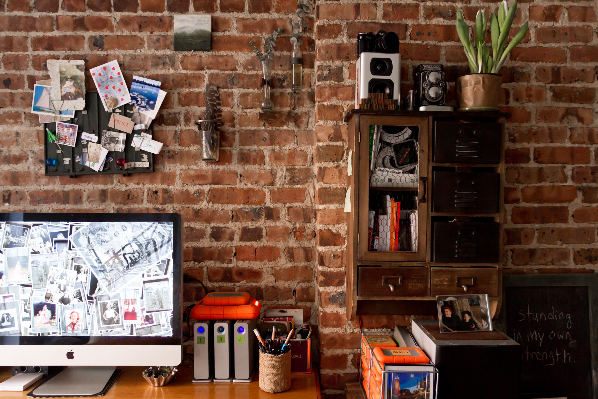 “My workstation is pretty compact but powerful,” says Kammerer, the daughter of artist Gregory Kammerer. “My desk was my dad’s old drafting table for painting – it’s a Danish piece. The most important piece of my desk and workstation is my iMac and over 20 terabytes of regular and backup storage, since video files are very large.”