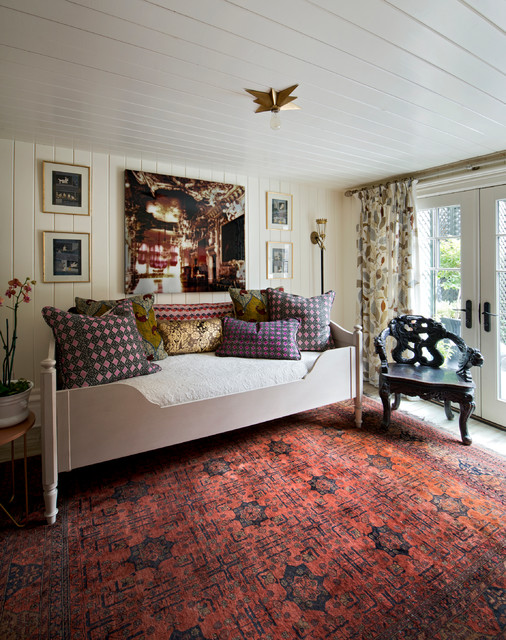 Southam’s son’s room – which is also used as a guest room – is in a refurbished space in the former garage, with French doors leading to the courtyard-patio. “It was wall-to-wall carpet on a concrete slab and unusable in the winter,” Southam says. The wood floors, which are heated, are covered with another rug from Pakistan. An eclectic mix of furnishings contrasts with the daybed. Southam also added a small galley or en suite bathroom on one side. “It’s pretty easy to enhance the value of a house by adding a room,” she says.