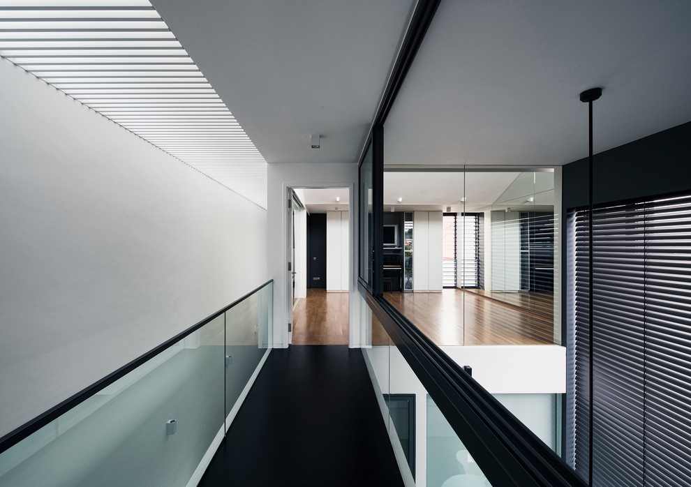 Leaving behind the Family Area, one crosses the link-bridge to the Dance Studio. On the left is the double-volume Gallery bathed with natural light and on the right, a double-volume Indoor Terrace below. (Photography by Beton Brut).