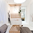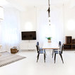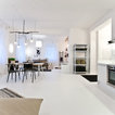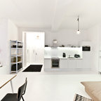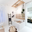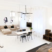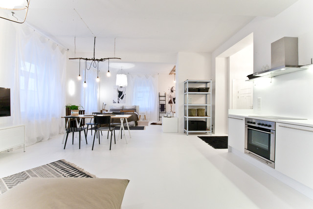 Das Loft hat durch den weißen Boden aus Epoxidharz auf Beton und Details wie nackte Glühbirnen Industriecharakter.
