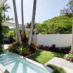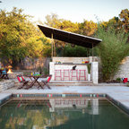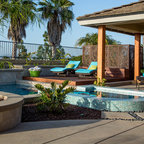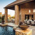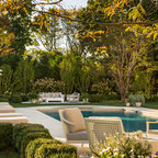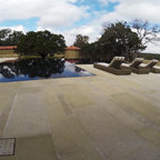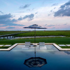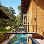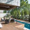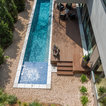 Pool oasis in Atlanta with large deck. The pool finish is Pebble Sheen by Pebble Tec, the dimensions are 8' wide x 50' long. The deck is Dasso XTR bamboo decking.